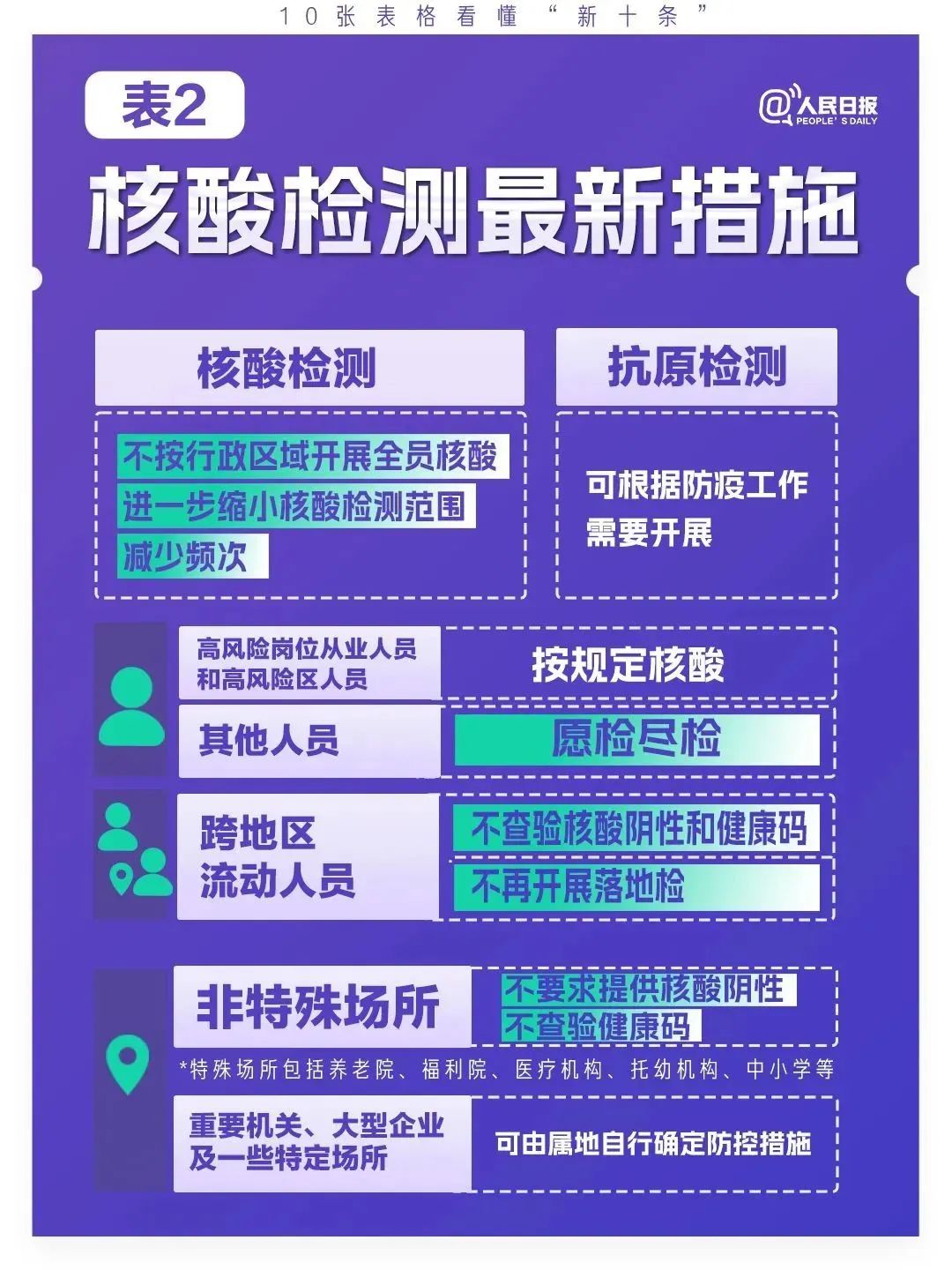 二是进一步优化核酸检测。不按行政区域开展全员核酸检测,进一步缩小核酸检测范围、减少频次。根据防疫工作需要,可开展抗原检测。对高风险岗位从业人员和高风险区人员按照有关规定进行核酸检测,其他人员愿检尽检。除养老院、福利院、医疗机构、托幼机构、中小学等特殊场所外,不要求提供核酸检测阴性证明,不查验健康码。重要机关、大型企业及一些特定场所可由属地自行确定防控措施。不再对跨地区流动人员查验核酸检测阴性证明和健康码,不再开展落地检。