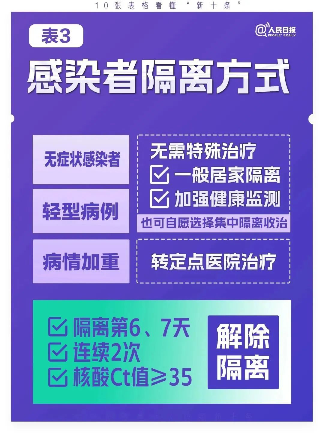 三是优化调整隔离方式。感染者要科学分类收治,具备居家隔离条件的无症状感染者和轻型病例一般采取居家隔离,也可自愿选择集中隔离收治。居家隔离期间加强健康监测,隔离第6、7天连续2次核酸检测Ct值≥35解除隔离,病情加重的及时转定点医院治疗。具备居家隔离条件的密切接触者采取5天居家隔离,也可自愿选择集中隔离,第5天核酸检测阴性后解除隔离。