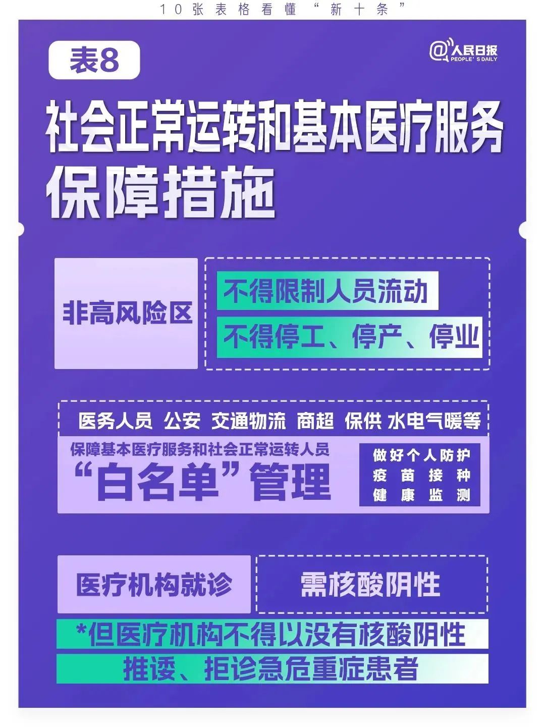八是保障社会正常运转和基本医疗服务。非高风险区不得限制人员流动,不得停工、停产、停业。将医务人员、公安、交通物流、商超、保供、水电气暖等保障基本医疗服务和社会正常运转人员纳入“白名单”管理,相关人员做好个人防护、疫苗接种和健康监测,保障正常医疗服务和基本生活物资、水电气暖等供给,尽力维护正常生产工作秩序,及时解决群众提出的急难愁盼问题,切实满足疫情处置期间群众基本生活需求。