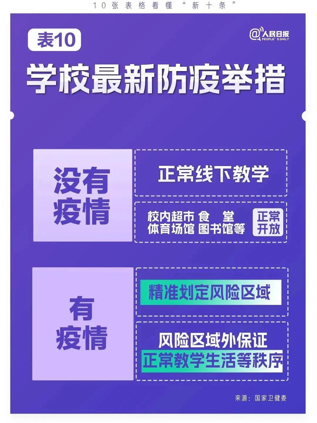 十是进一步优化学校疫情防控工作。各地各校要坚决落实科学精准防控要求,没有疫情的学校要开展正常的线下教学活动,校园内超市、食堂、体育场馆、图书馆等要正常开放。有疫情的学校要精准划定风险区域,风险区域外仍要保证正常的教学、生活等秩序。