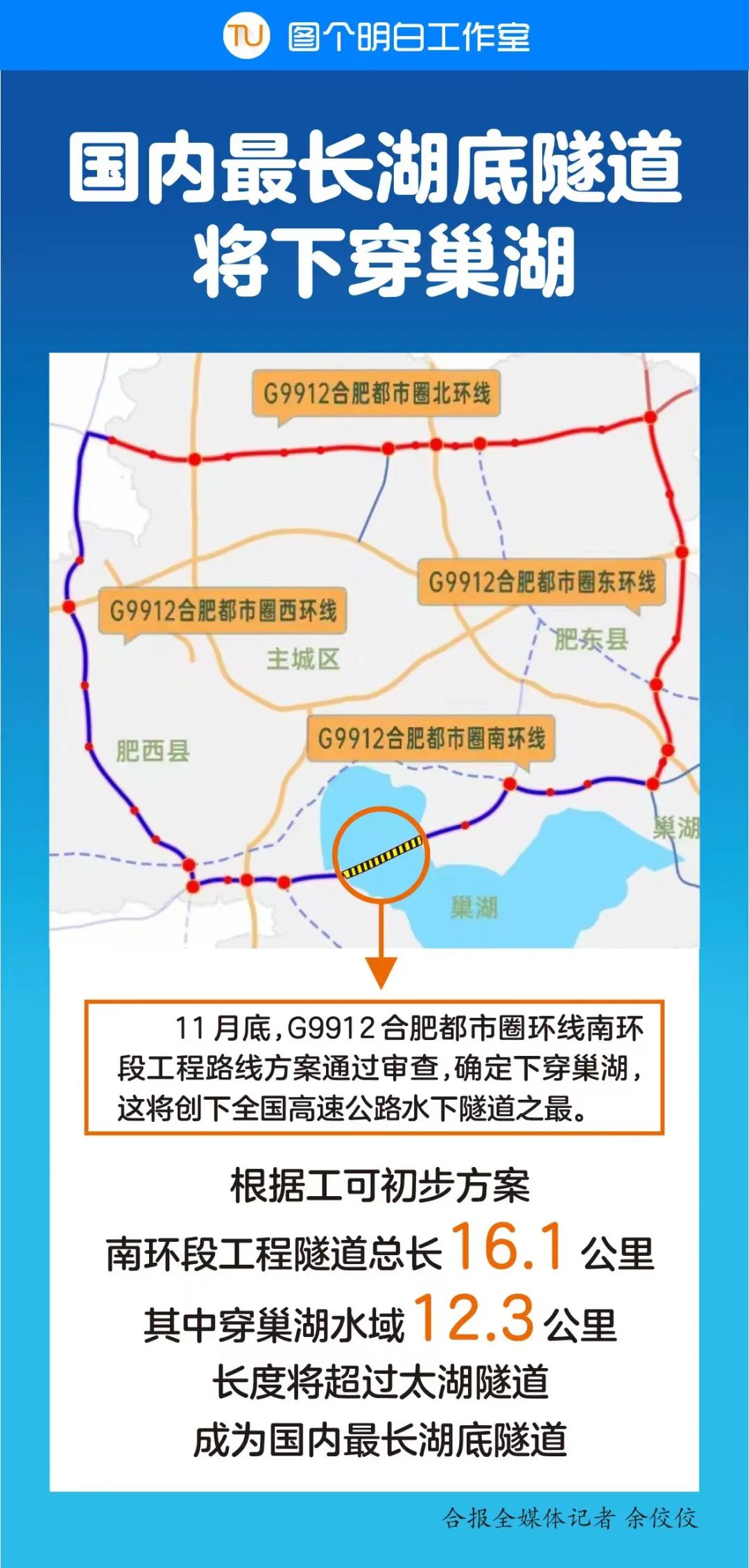 “整体路线大体确定,目前正在进行工可方案审查,勘察设计招标工作也已经启动。”合肥交通投资控股有限公司副总经理程岗告诉记者,11月底,公司以线上、线下结合方式组织召开G9912合肥都市圈环线南环段工程路线方案审查会,南环段工程路线方案已经通过审查,确定下穿巢湖,这将创下全国高速公路水下隧道之最。