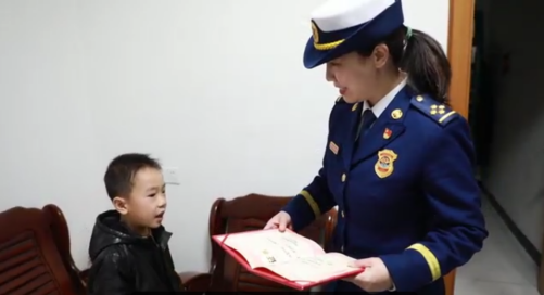 株洲市荷塘区消防救援大队防火监督员给小朋友颁发证书