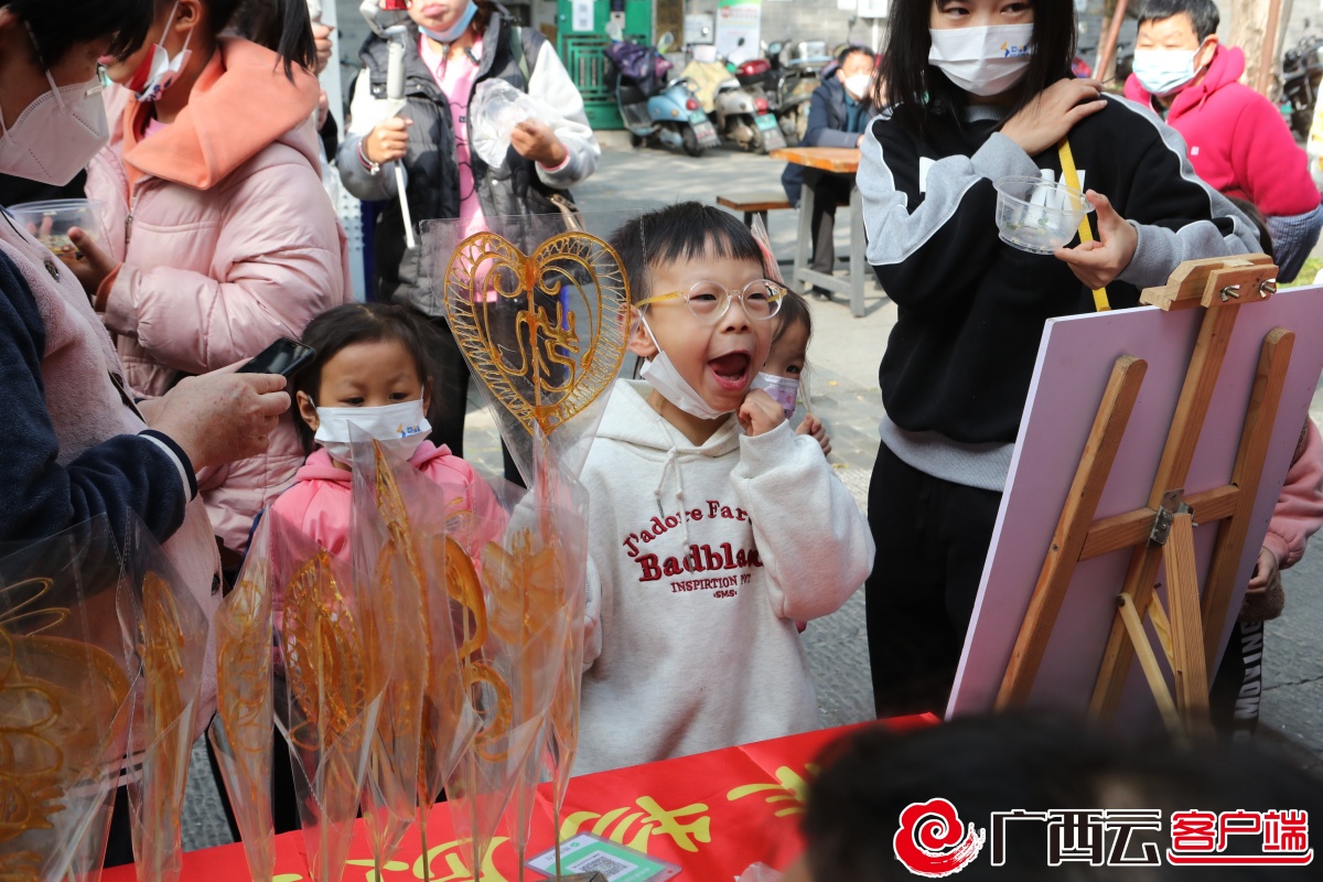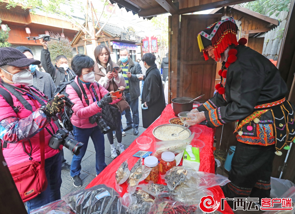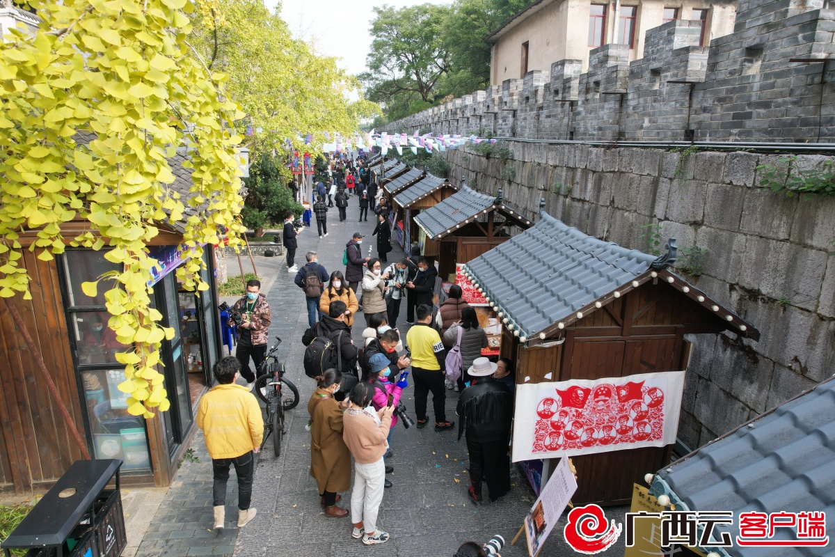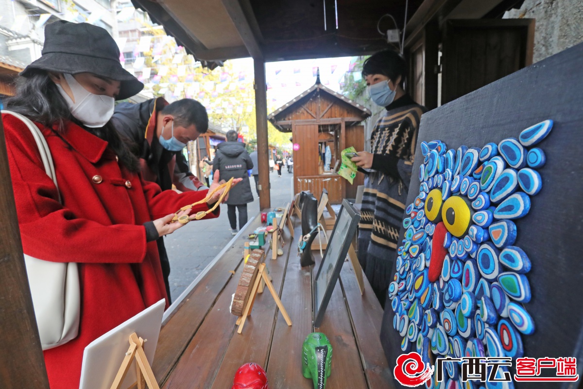 12月12日,在桂林市王城西华门科第巷的桂林艺术节·非遗文创集市,巷道行人络绎不绝,两侧展位林立,特色展品琳琅满目,展位里不时传出动听的音乐。