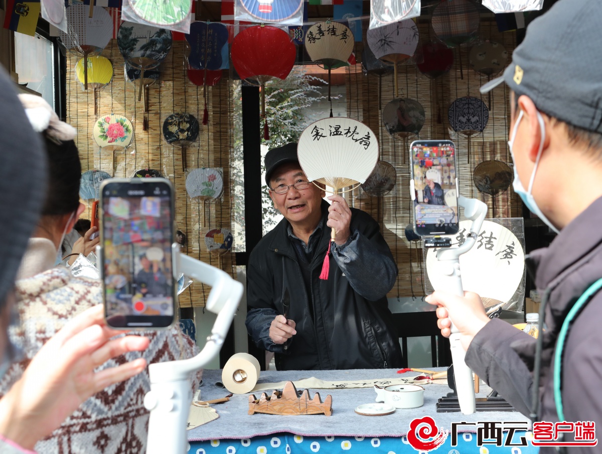 桂林艺术节非遗文创集市上,游客在围观老艺人制作传统工艺扇。图片均为广西日报-广西云客户端记者 周军 徐天保 摄