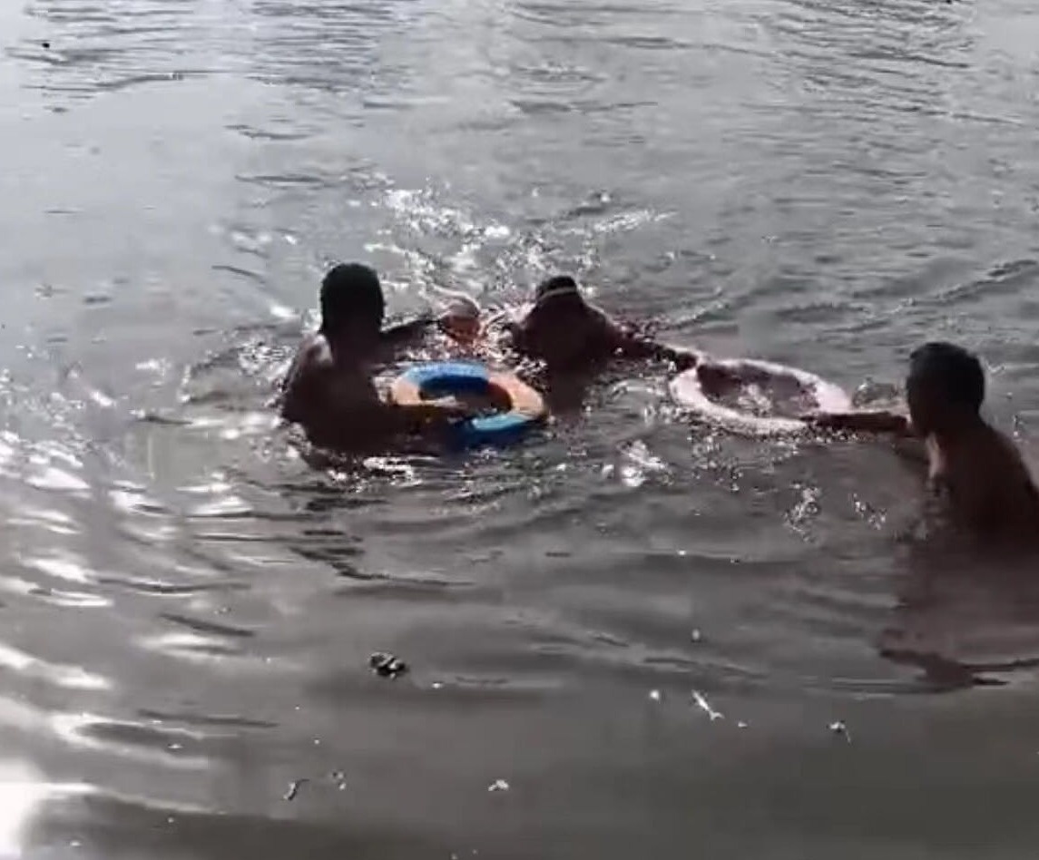 得知这名女子是抱着救生圈在顺水漂流,众人赶忙下水施救。