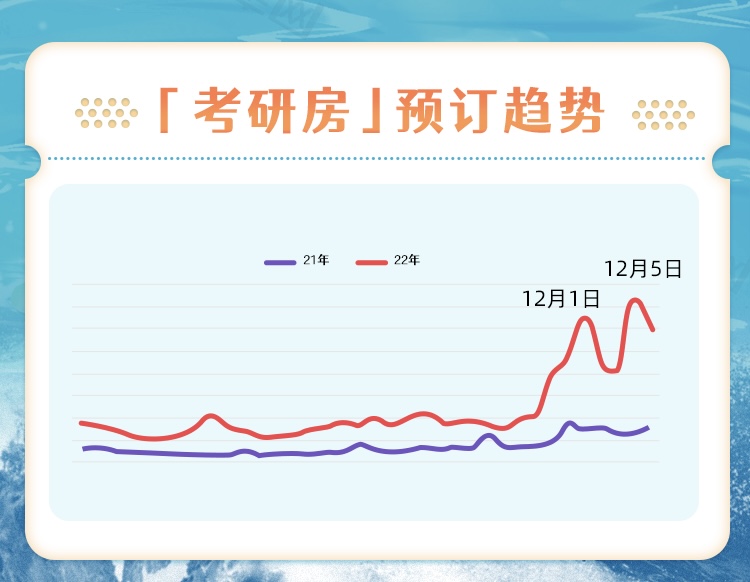随着2023年考研迎来倒计时,“考研房”关注度加速攀升。同程旅行数据显示,近一周以来,平台上以“考研”为关键词的搜索量环比上升超300%。12月1日,各地发了考研相关通知之后,酒店当日预订量较前一日上涨50%,超过11月单日峰值的2.2倍。据业内人士预测,“考研房”预订将在准考证打印当日迎来今年峰值。