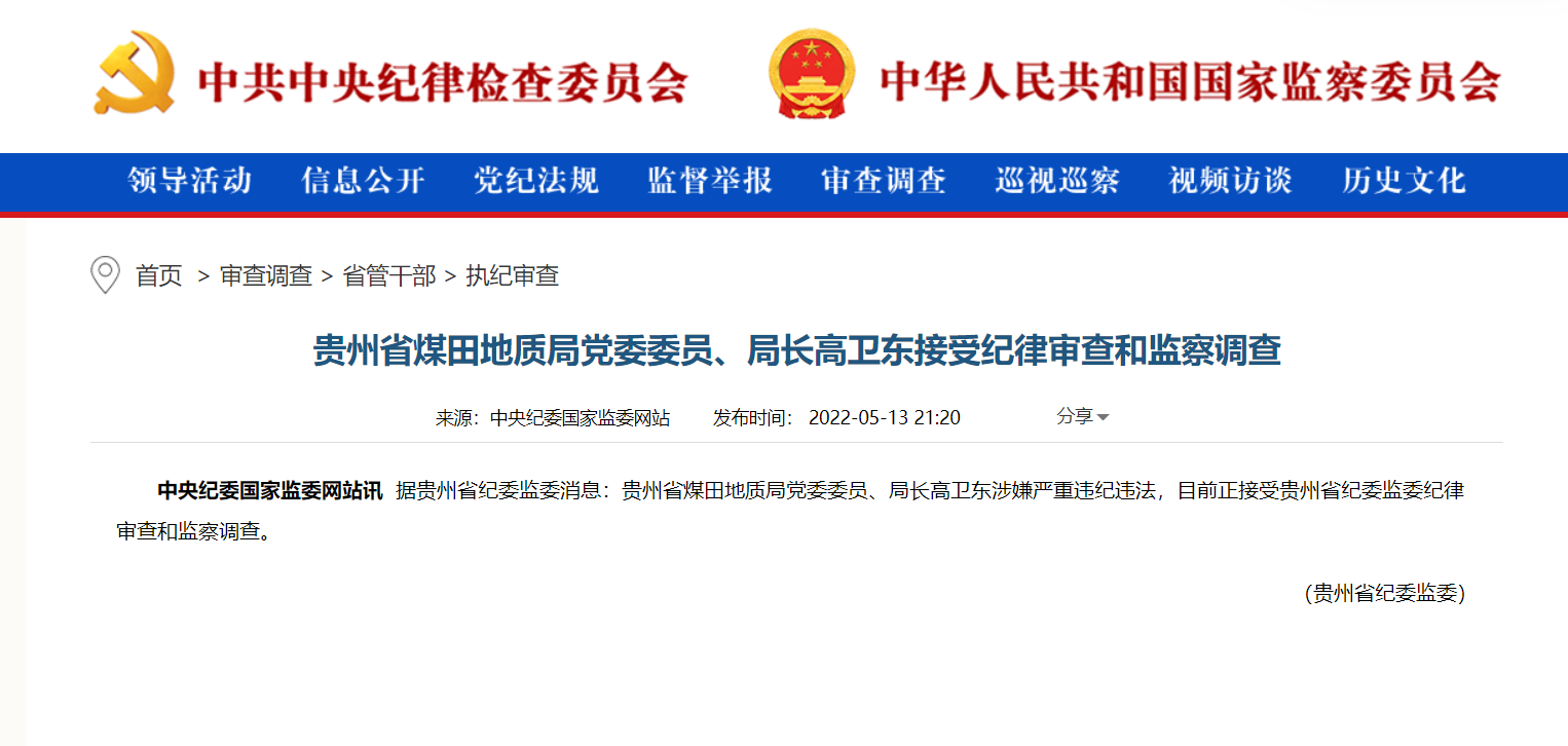 2022年5月13日,中央纪委国家监委网站消息,贵州省煤田地质局党委委员、局长高卫东涉嫌严重违纪违法,目前正接受贵州省纪委监委纪律审查和监察调查。