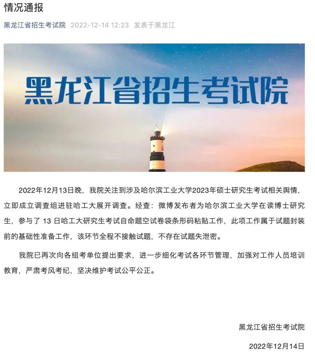 14日,黑龙江省招生考试院也发布情况通报称,经查:微博发布者为哈尔滨工业大学在读博士研究生,参与了13日哈工大研究生考试自命题空试卷袋条形码粘贴工作,此项工作属于试题封装前的基础性准备工作,该环节全程不接触试题,不存在试题失泄密。