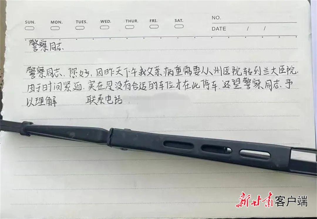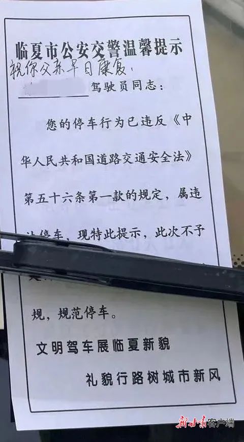 事情发生在12月11日,临夏市公安局交警大队四中队中队长马裕和在辖区周边巡逻管控时,发现一辆白色小型客车在临夏州人民医院周边的道路上违停,便向前查看情况。令马裕感到意外的是,车窗上附了一张纸条,内容为:“警察同志,您好,因昨天下午我父亲病重需要从州医院转到兰大医院,由于时间紧迫,实在是没有合适的车位才在此停车,还望警察同志予以理解。”随即,马裕与车主取得联系,在核实情况后,根据柔性执法相关规定,变处罚为提示,并在提示卡上留下“祝你父亲早日康复”的暖心祝福语。