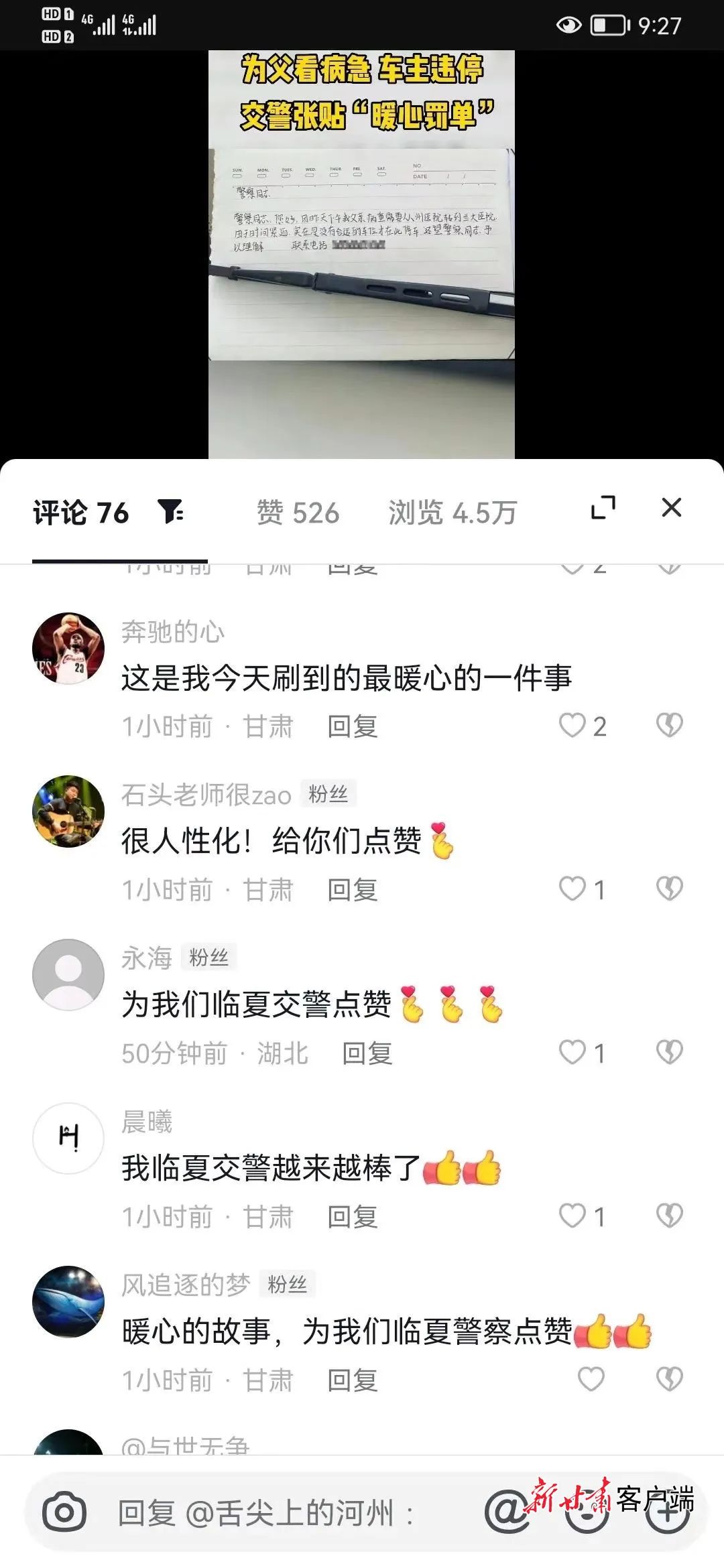 违规停车没有被处罚,反而被温暖包裹!八个字,却让车主铭记一辈子,也对今后文明驾驶有了更深刻的认识。原来,近日我省临夏州临夏市公安局交警大队民警开出了一张暖心“罚单”,引发了广大网友关注,网友纷纷转发点赞评论:“临夏好交警”“为临夏交警的人性化执法点赞”!