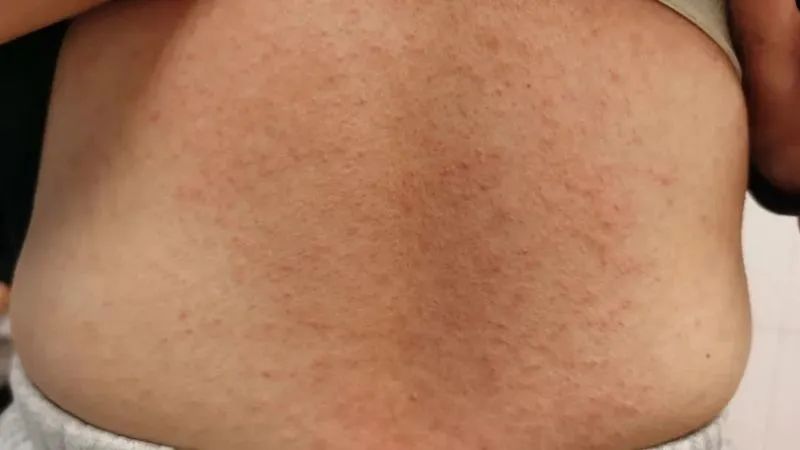 到了第2天,她面部的红肿更加严重了,甚至眼睛都被肿得“挤成”了一条缝;面部、腹部、背上以及四肢都出现了一片片红斑,红斑上还覆有密集的小脓疱,令人瘙痒难耐。除了皮肤上的变化,周女士还出现了呼吸困难、发热的情况,甚至一度烧到了39℃。