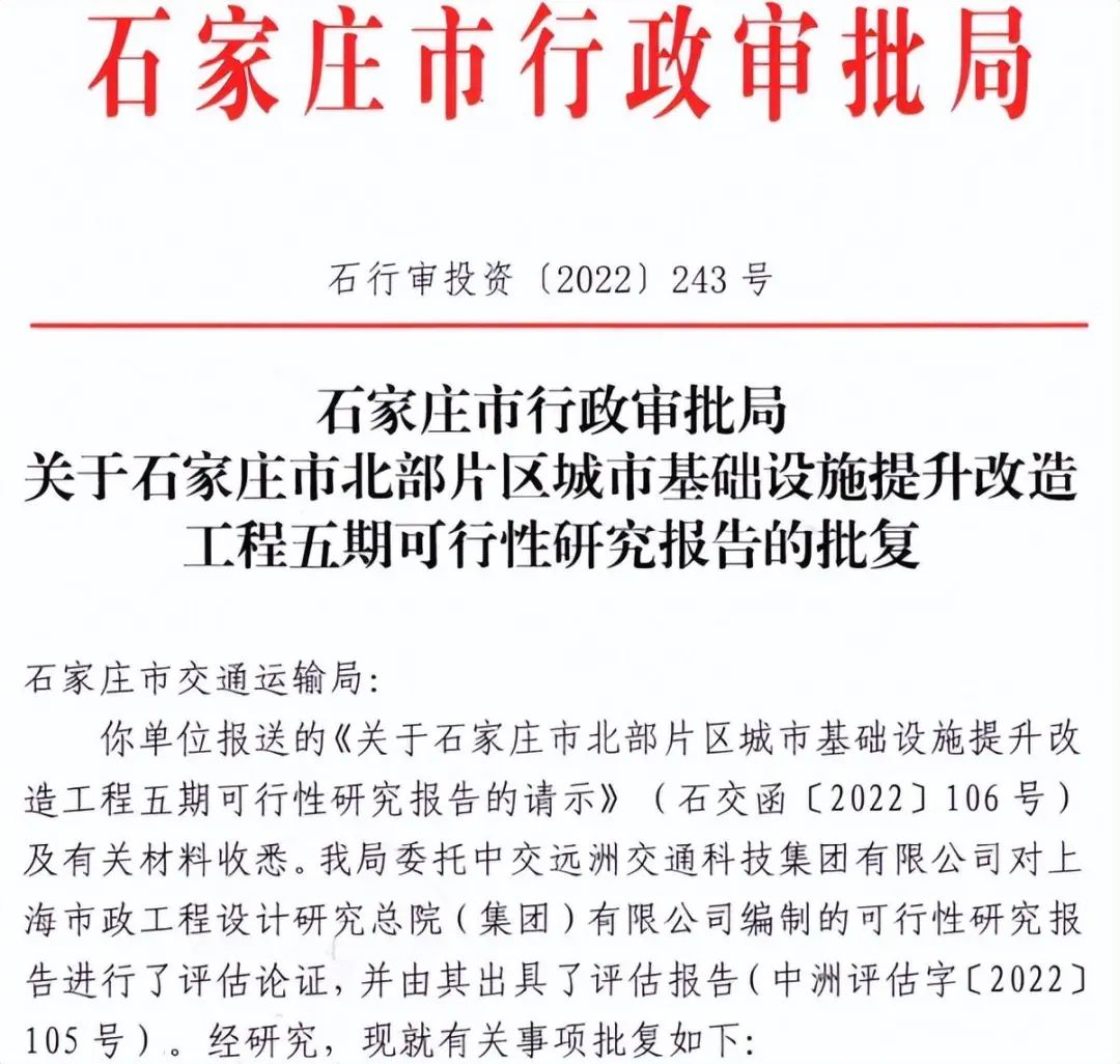 石家庄市行政审批局近日发文,对石家庄市北部片区城市基础设施提升改造工程五期可行性研究报告做出批复。