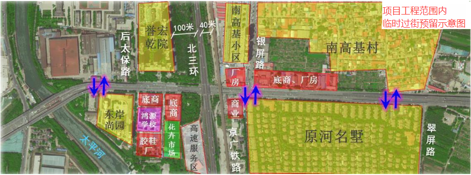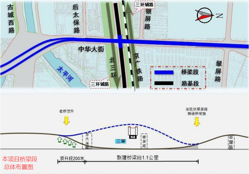 其中,桥梁工程方面,中华北大街改造南起后太保路以南,对现状老桥进行顶升,长度约200米,然后向北新建双向6车道高架上跨北三环与京广货运铁路,高架长度1.1公里,相应改造中华大街桥下辅路。