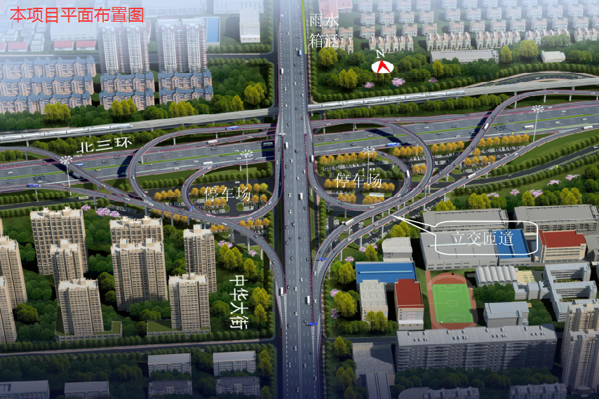 中华大街与北三环节点立交,含南侧集散车道,共计9条匝道。桥梁设计使用寿命为100年。
