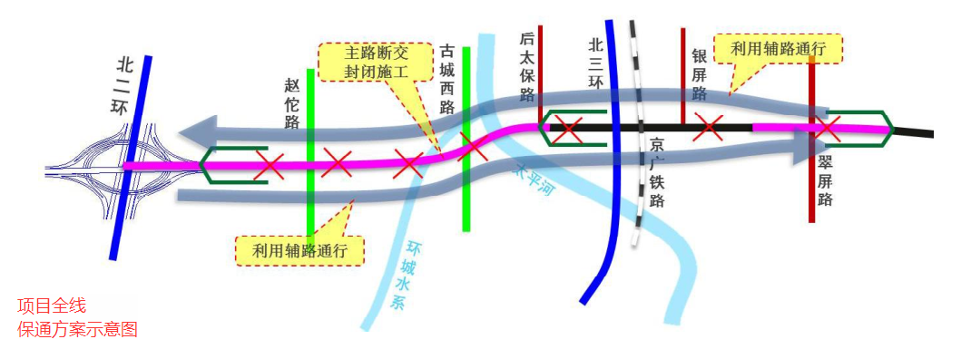 保通方案方面:结合现中华大街主路出入口,对赵佗路至翠屏路段主路进行封闭断交,对工程内主路进行围挡施工;南北向通过两侧辅路通行,保证双向四车道规模。沿线小区、企业等预留过街及车辆掉头通道。