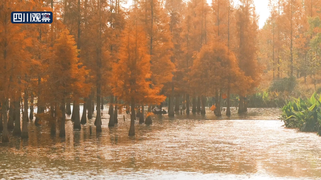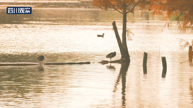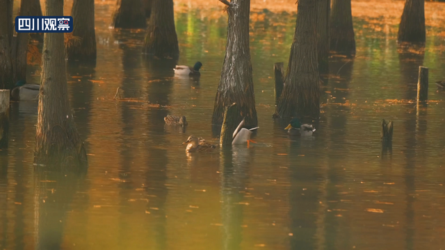 12月12日,四川成都,摄影师在白鹭湾湿地公园拍到成群的野鸭、白鹭与红杉林同框的温暖画面。