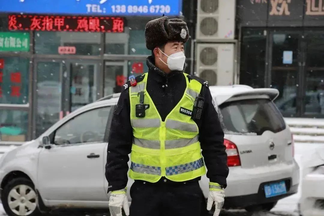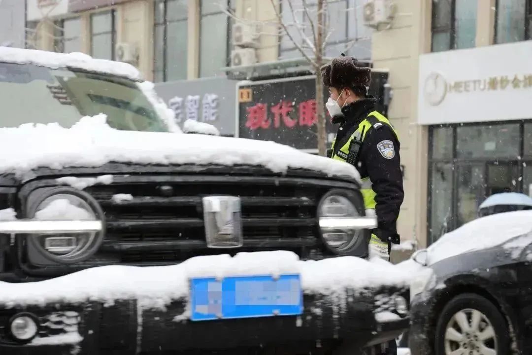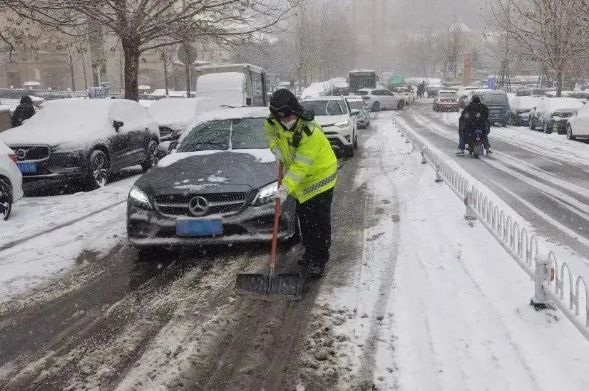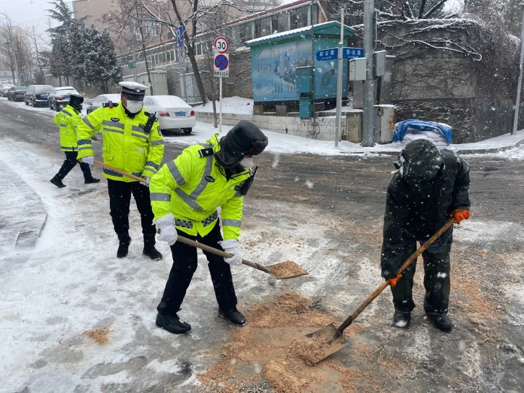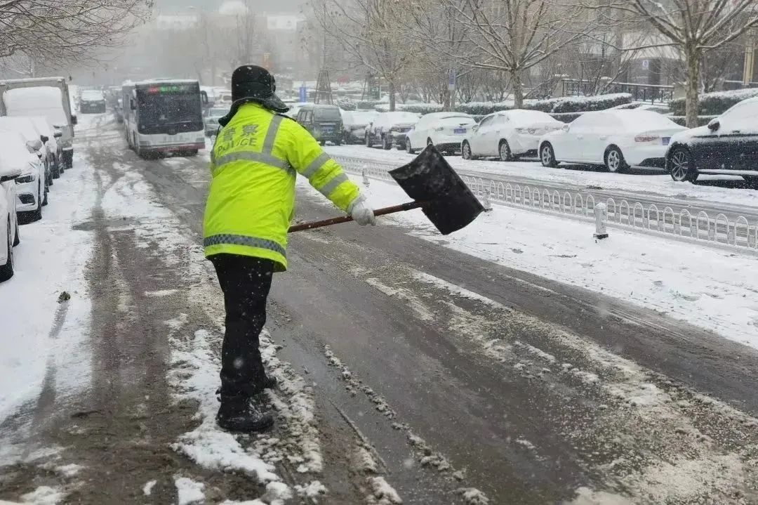 交警支队高新大队民警在积雪严重路段,清理路面积雪,维护道路安全畅通。