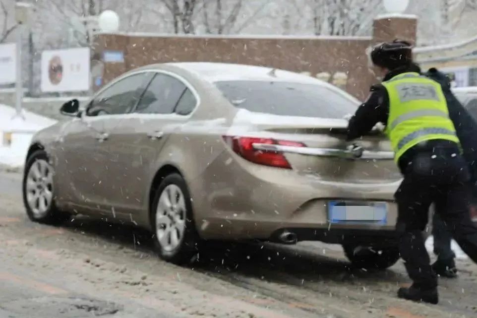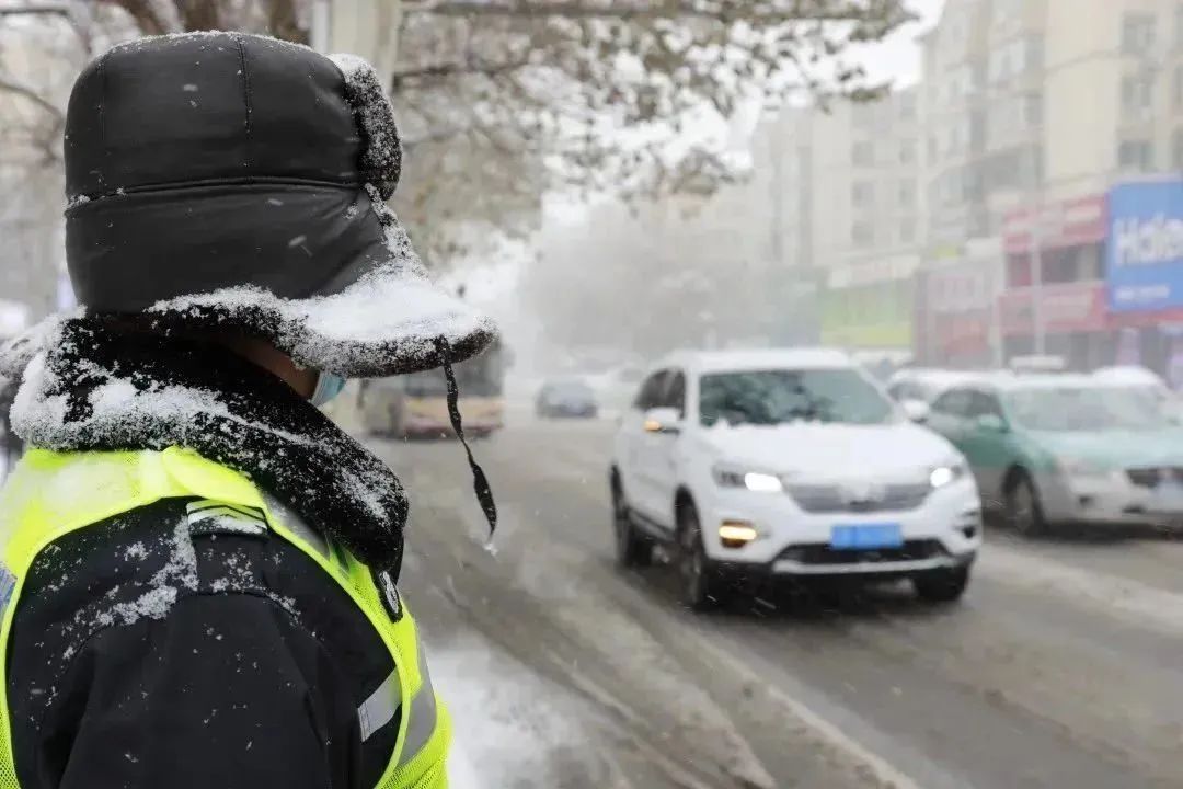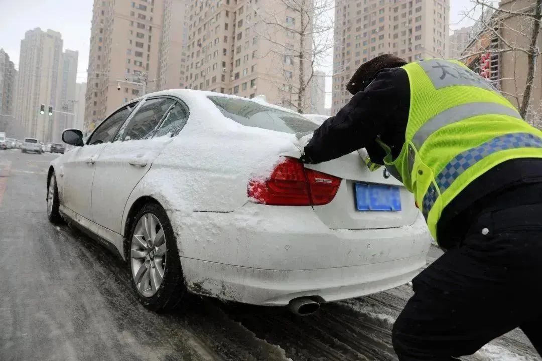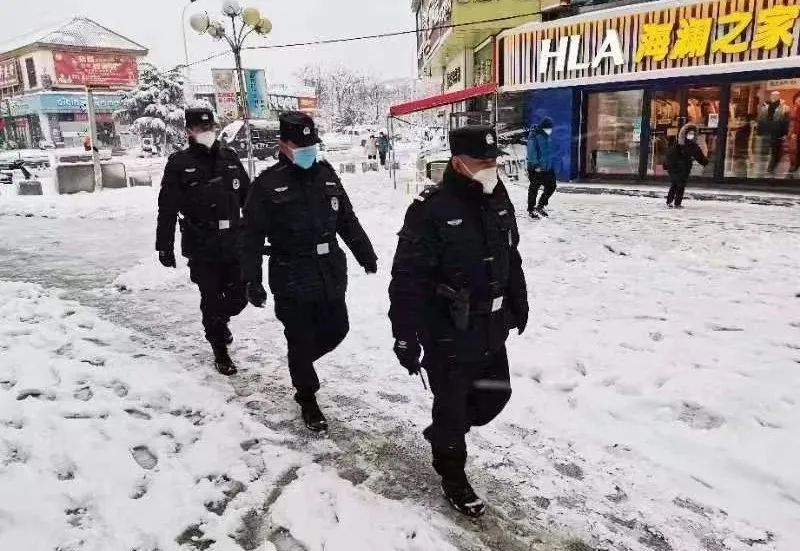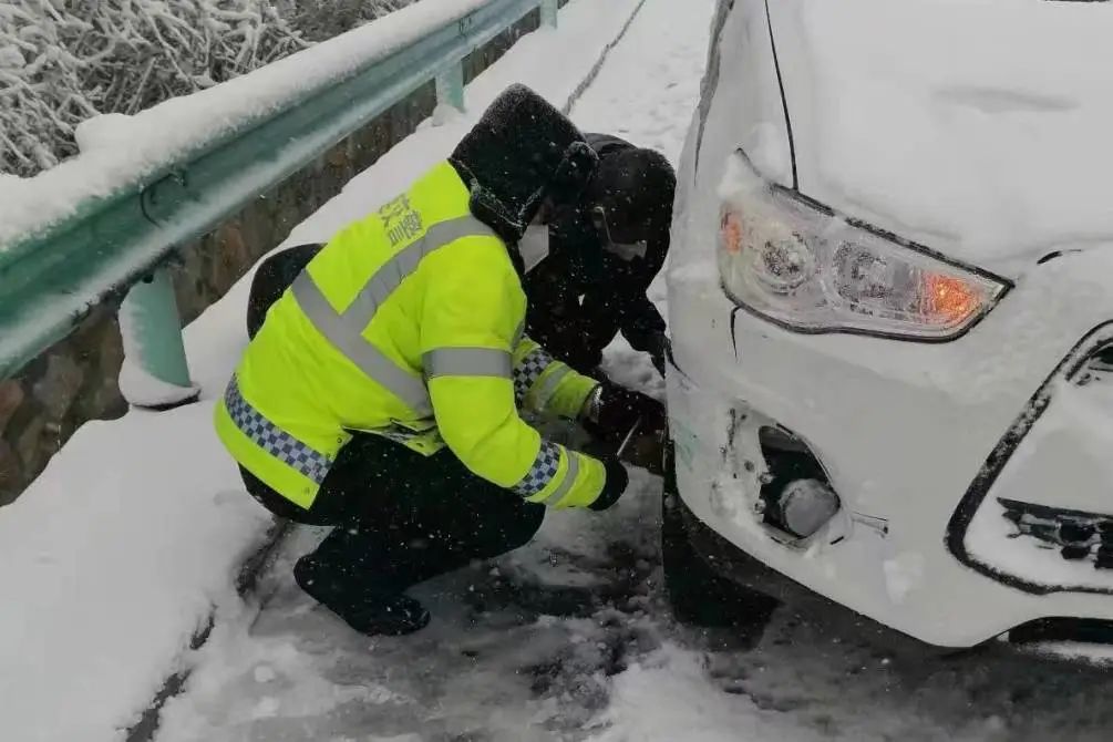交警支队高新大队民警在积雪严重路段,清理路面积雪,维护道路安全畅通。