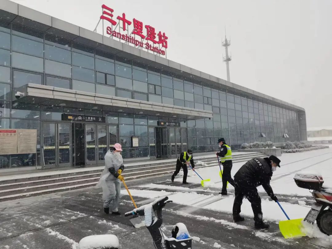 公交分局民警协助清理地铁站出入口附近积雪,并加强站内巡逻,保障乘客安全出行。
