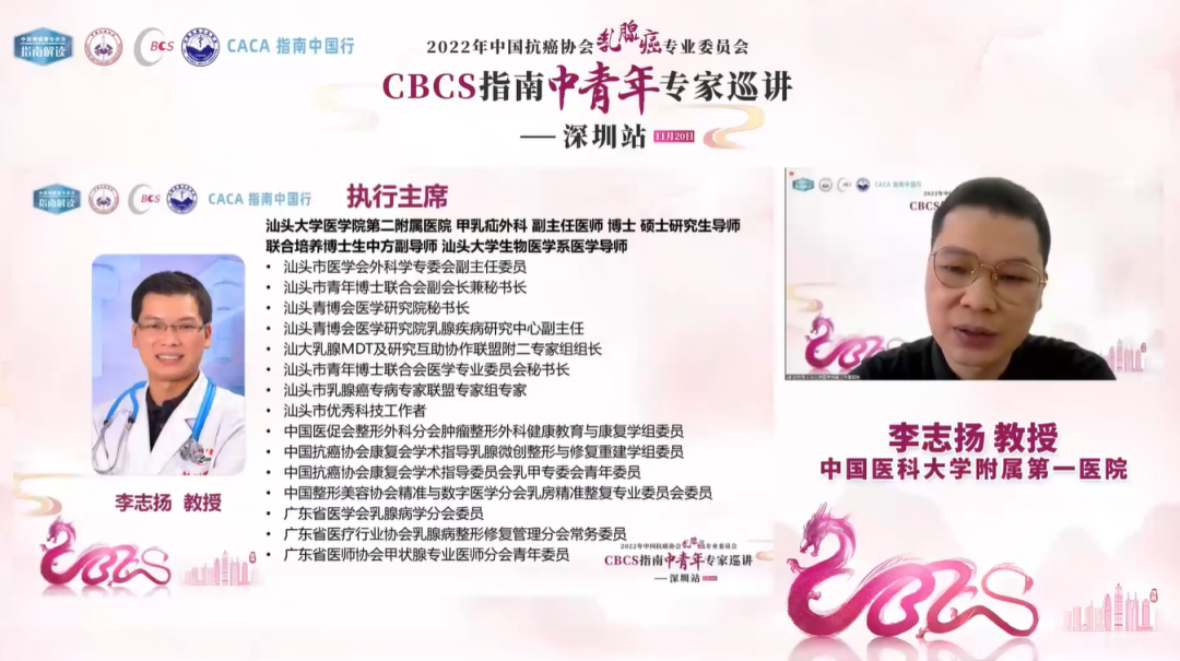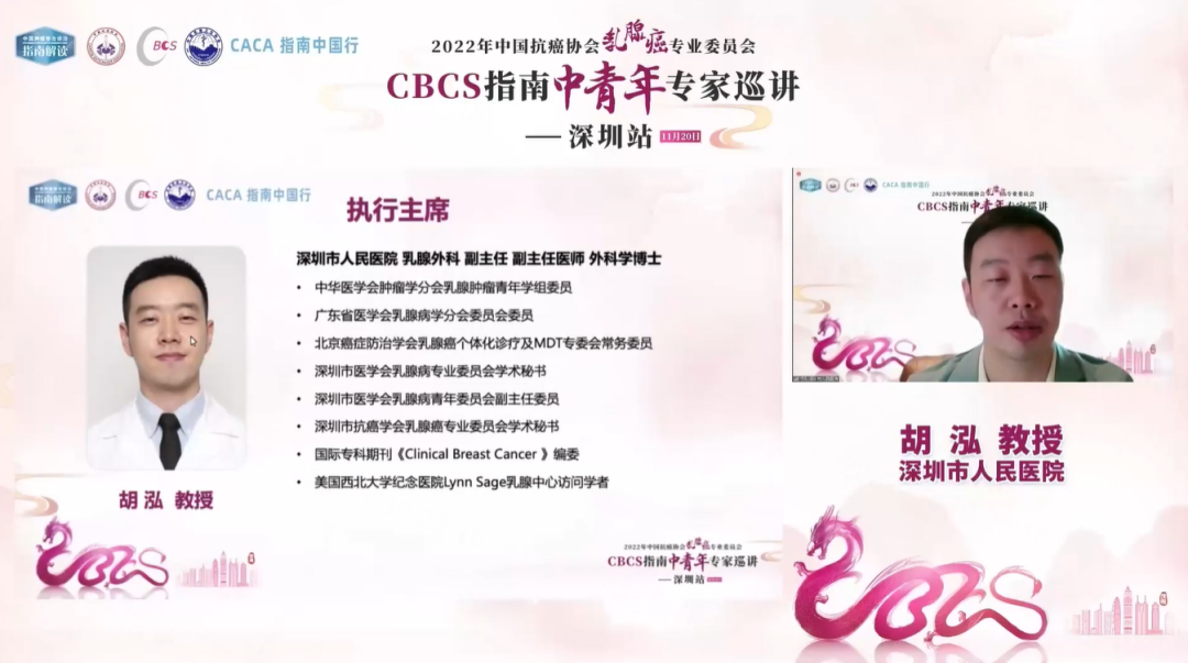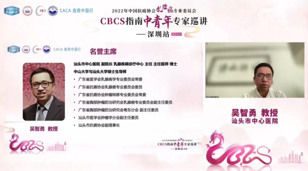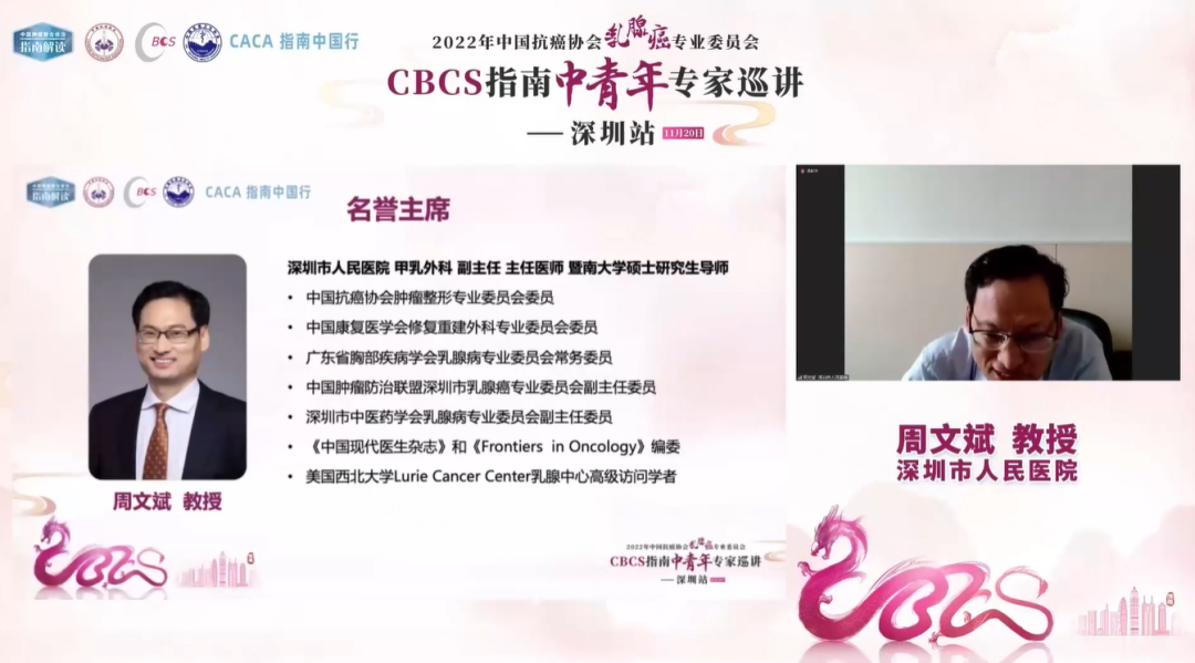 2022年11月20日,由中国抗癌协会乳腺癌专业委员会(CBCS)、中国民族卫生协会共同主办,深圳市人民医院承办的《中国抗癌协会乳腺癌诊治指南与规范(2021年版)》全国巡回报告会中青年专家巡讲深圳站成功召开。本次巡讲汇聚国内外乳腺癌领域知名专家学者,围绕CBCS指南解读、国内外指南差异及临床病例,为与会者呈现了一场精彩绝伦的学术盛会。现撷取会议重点内容整理如下,以飨读者。主席致辞:CBCS指南专家巡讲深圳站拉开序幕
