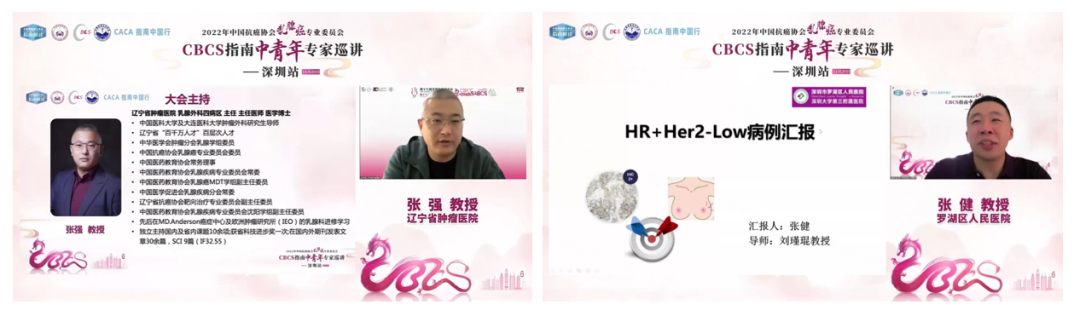 而后,在辽宁省肿瘤医院张强教授的主持下,罗湖区人民医院张健教授分享了一例“HR+/HER2-low的病例”,揭阳市人民医院徐国栋教授,汕头大学医学院附属肿瘤医院曾德教授、翟田田教授、魏晓龙教授,韶关市第一人民医院卢海教授,深圳市人民医院杨翼鹏教授对这一病例的治疗过程及治疗策略进行了讨论。