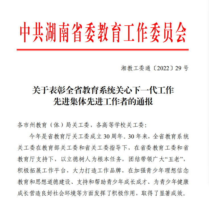 近日,省委教育工委印发《关于表彰全省教育系统关心下一代工作先进集体先进工作者的通报》,表彰了一批全省从事关心下一代工作的先进集体和个人。我校共有6个集体、12名个人获奖,实现五大奖项全覆盖。获奖数量居全省高校第一。