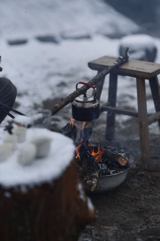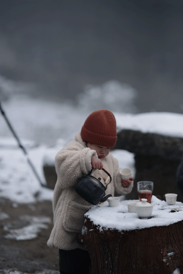 待清冽的雪水裹着蒸腾的热气倾泻而下,击打到杯壁上泛出的泡沫比雪花更添三分洁净。茶叶在杯中尽情舒展、翻滚,化作澄澈茶汤从喉间滑过,甘甜、柔滑,齿间微微生津,令他通身俱暖,突然腹中传来“咕咕”的叫声,似乎进食的欲望也被茶汤所唤醒。