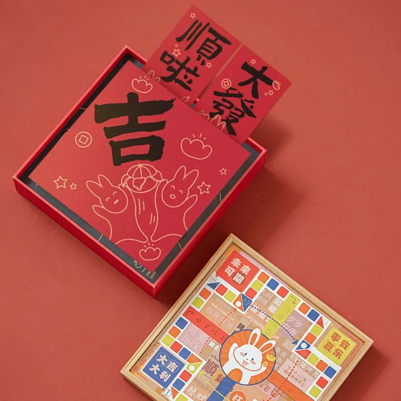 更哇塞的是,欢喜兔盒盖巧妙设计成棋盘样式,一面是飞行棋盘,另一面是围棋盘,新年闲暇之余,与孩子、长辈愉快PK,因工作繁忙或异地产生的距离转眼消融,万千情意都在棋中。