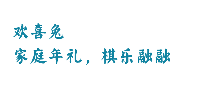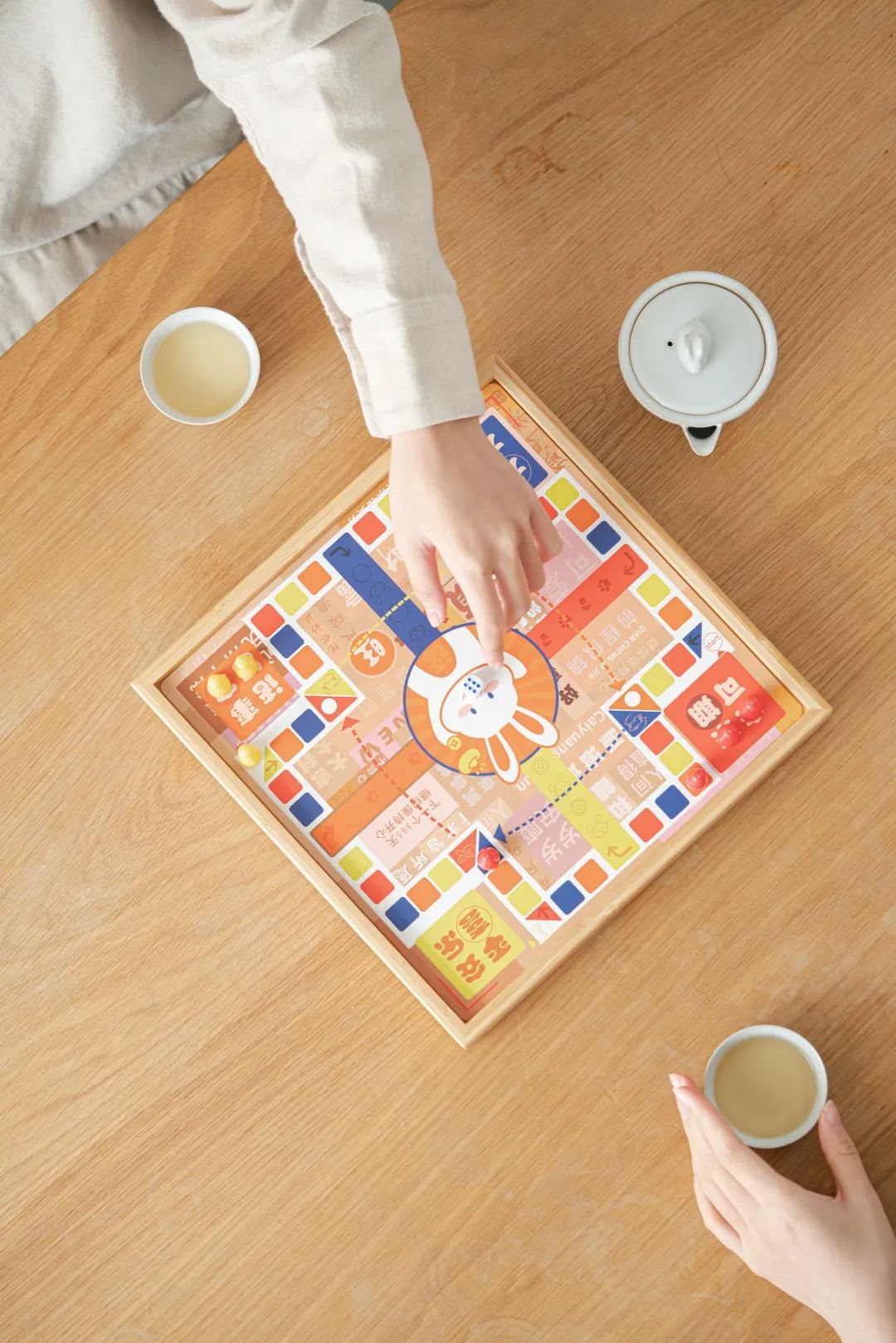 过年之时,全家老少聚在一起,大人之间相互问候,而小朋友却全心沉浸在快乐的气氛中。欢喜兔盒盖巧妙设计成棋盘样式,一面是飞行棋,闲暇之余,大人与孩子愉快PK一场,共享欢聚时刻。