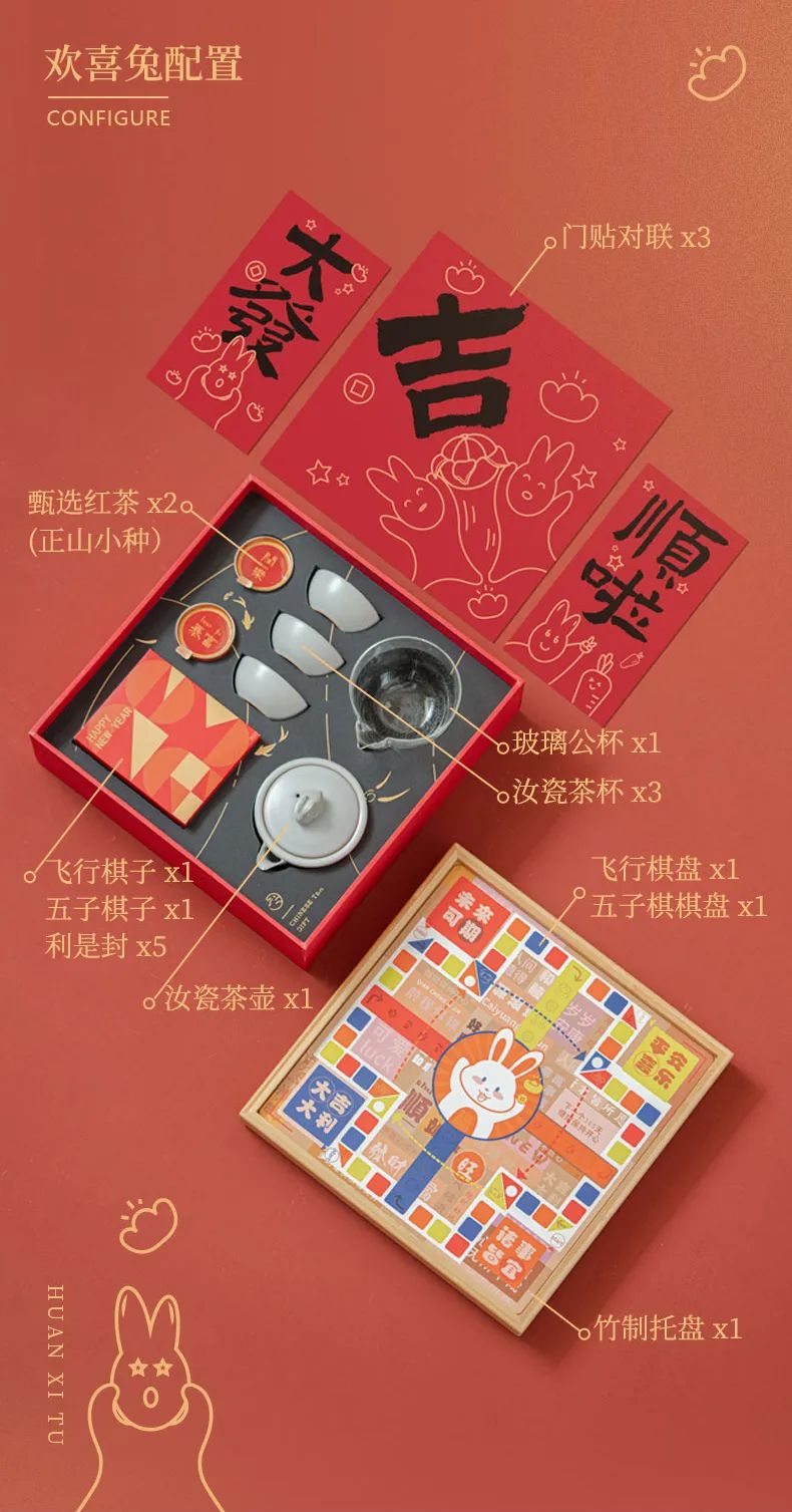 欢喜兔礼盒除了月白色便携茶壶,更有甄选红茶2罐(正山小种)、红包5封、新年门贴、手提袋...一次性满足你的年味需求。