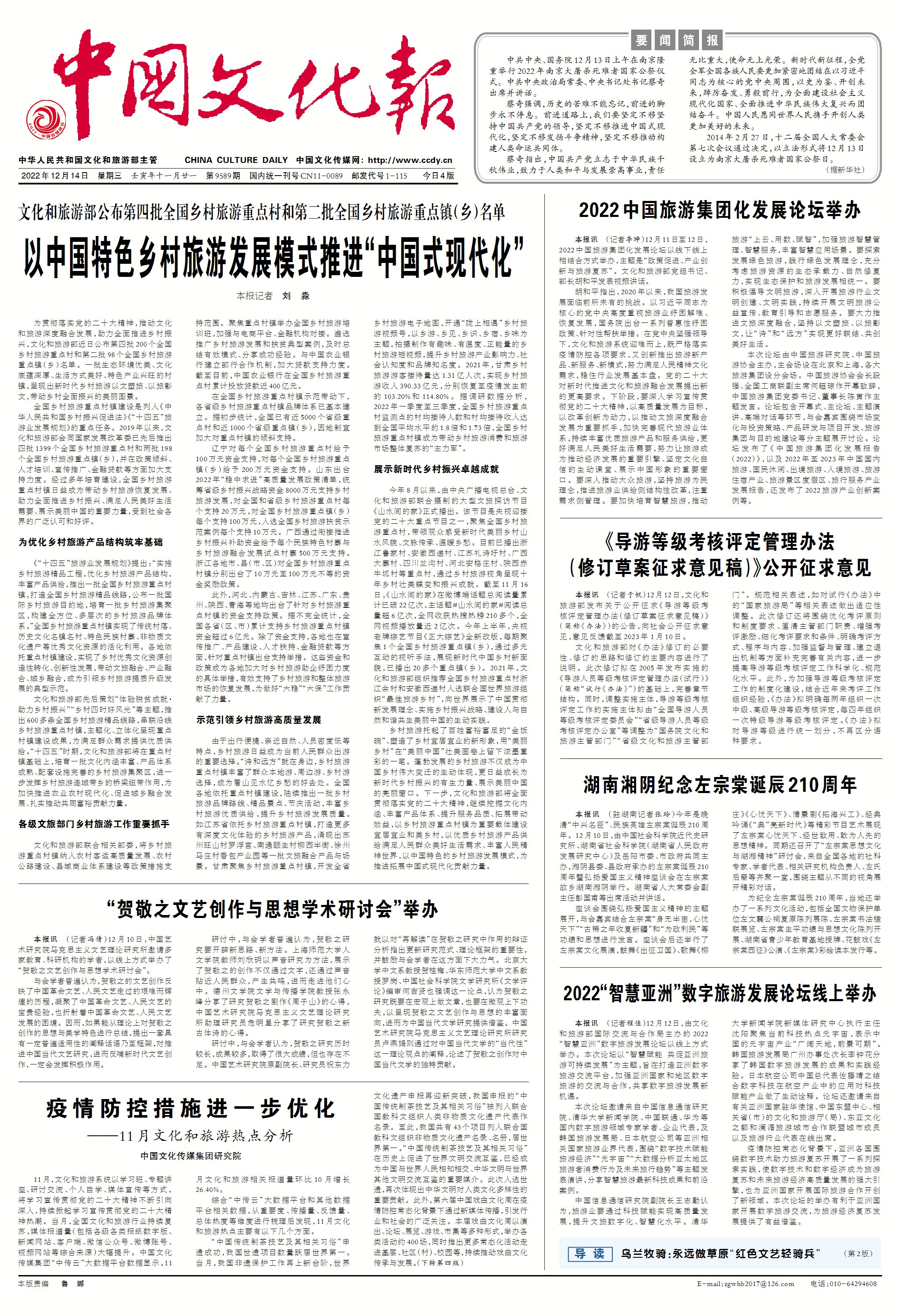 今年8月以来,由中央广播电视总台、文化和旅游部联合摄制的大型文旅探访节目《山水间的家》正式播出。该节目是央视迎接党的二十大重点节目之一,聚焦全国乡村旅游重点村,带领观众感受新时代美丽乡村山水风貌、文脉传承、温暖乡愁。目前已播出浙江鲁家村、安徽西递村、江苏礼诗圩村、广西大寨村、四川兰沟村、河北安格庄村、陕西赤牛坬村等重点村,通过乡村旅游视角呈现十年乡村壮美蝶变和振兴成就。截至11月16日,《山水间的家》在微博端话题总阅读量累计已破22亿次,主话题#山水间的家#阅读总量超6亿次,全网收获热搜热榜210多个,全网视频播放量近2亿次。今年上半年,央视老牌综艺节目《正大综艺》全新改版,每期聚焦1个全国乡村旅游重点镇(乡),通过多元互动的视听手法,展现新时代中国乡村新面貌,已播出20多个重点镇(乡)。2021年,文化和旅游部组织推荐全国乡村旅游重点村浙江余村和安徽西递村入选联合国世界旅游组织“最佳旅游乡村”,向世界展示了中国贯彻新发展理念、实施乡村振兴战略、建设人与自然和谐共生美丽中国的生动实践。