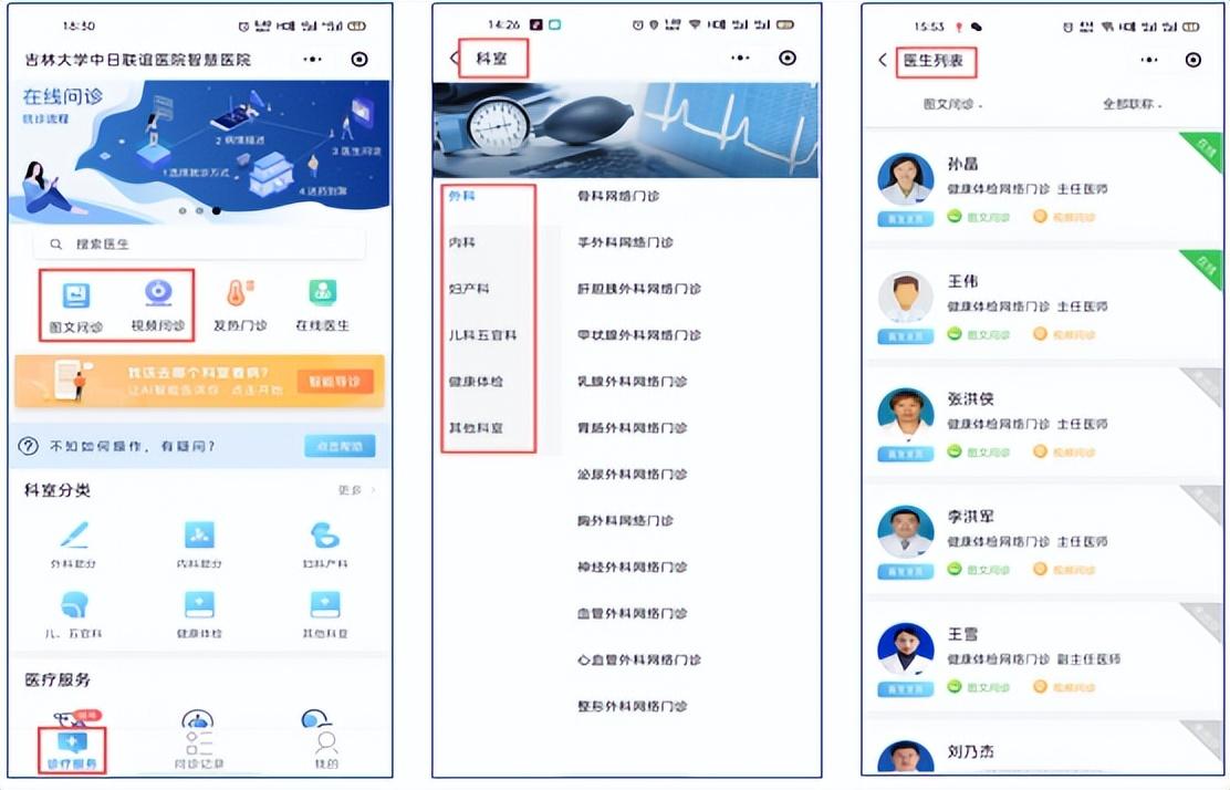 第一步:点击小程序【诊疗服务】,选择【图文问诊或视频问诊】,患者根据自己的症状,选择对应的科室及医生。