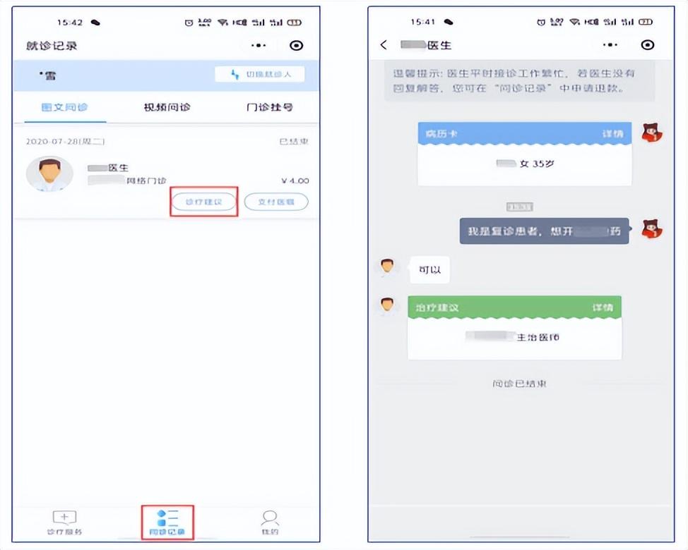 点击小程序【问诊记录—诊疗建议】,可与医生进行问诊咨询并查看医生回复信息。