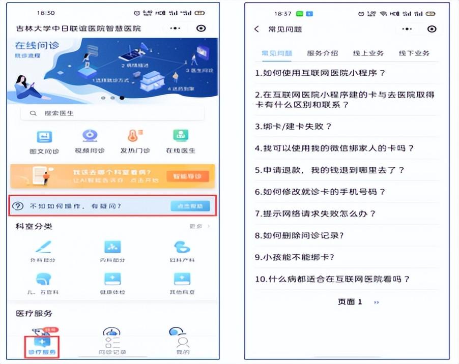 点击小程序【诊疗服务】,选择【点击帮助】,可查询常见问题等解决办法。