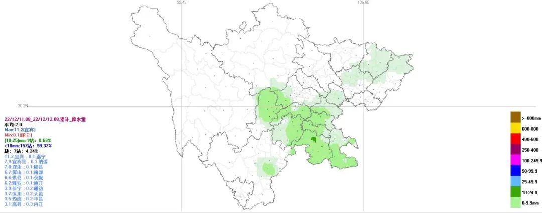 昨天08时到今天08时, 盆地西部、南部、东北部部分地方小雨,南部个别地方中雨,其余地方阴天间多云,川西高原、攀西地区晴。盆地最低气温6到8度,最高气温,北部8到11度,其余地方10到13度。