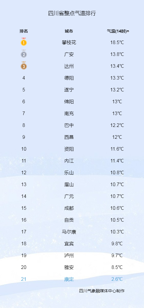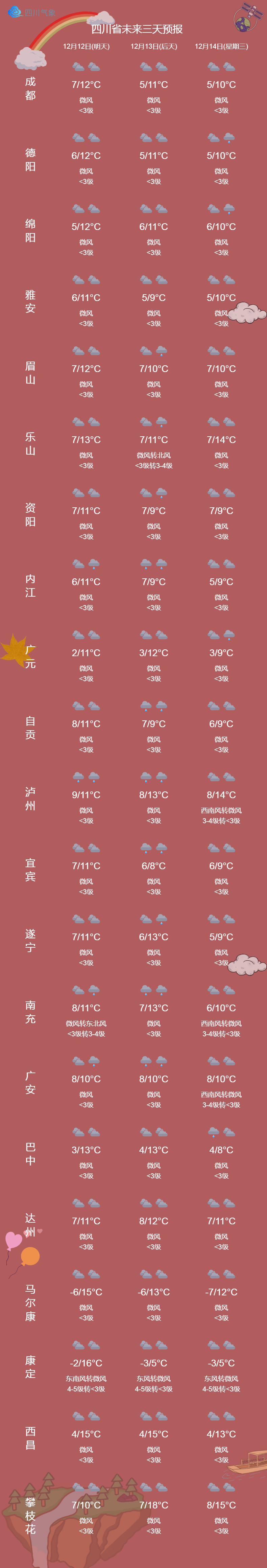 明天白天:南充、广安、遂宁、资阳、内江、自贡、宜宾、泸州8市及盆地西部沿山地区阴天有小雨或零星小雨,高海拔地区有雨夹雪,盆地其余地方阴天间多云;川西高原晴间多云,攀西地区多云,东北部有阵雨(雪)。