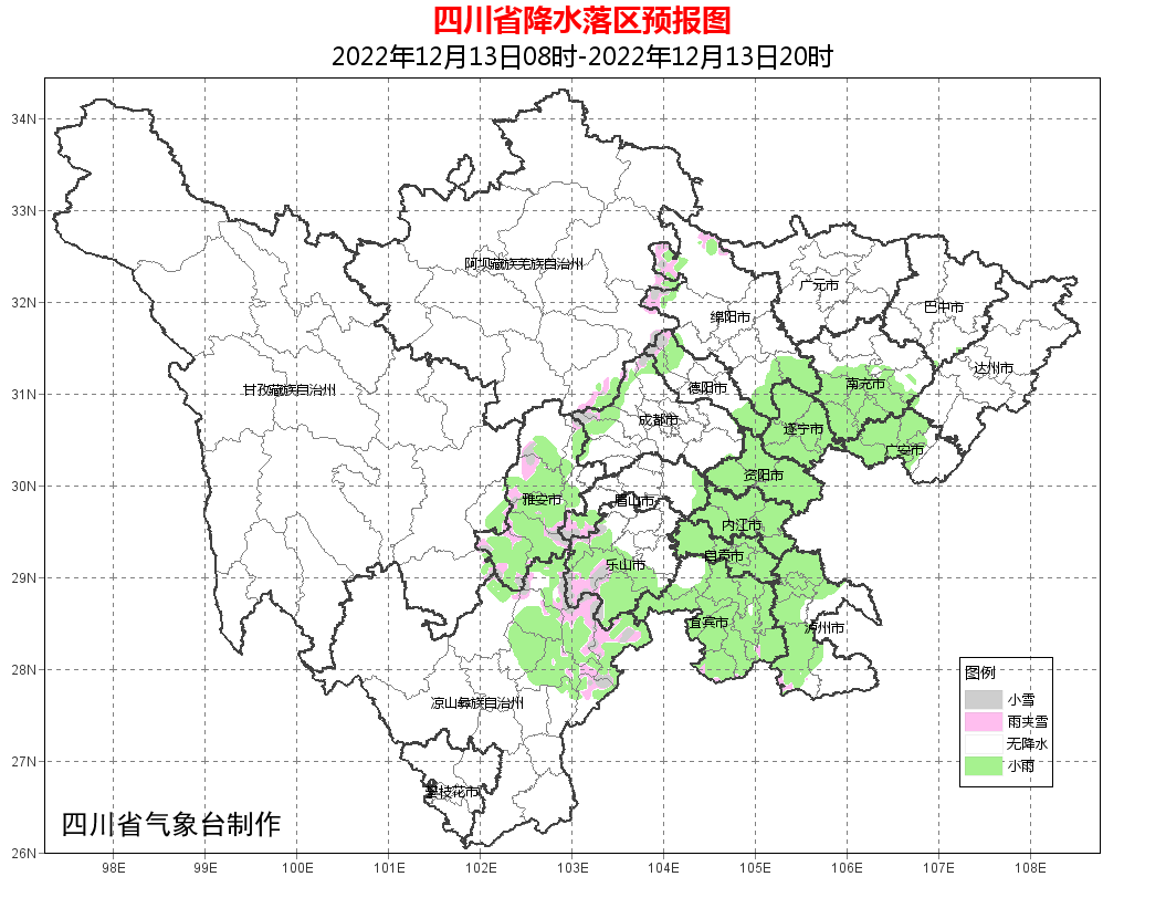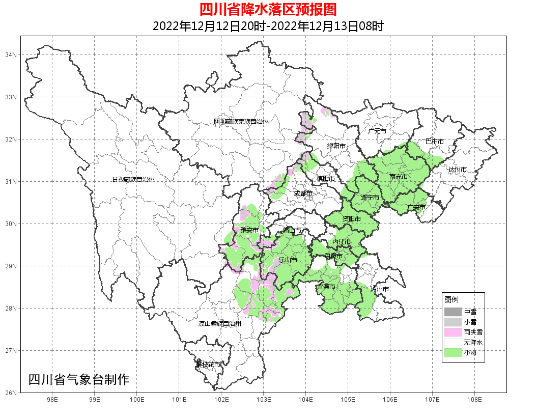 今天晚上:南充、广安、遂宁、资阳、内江、自贡、宜宾、泸州8市及盆地西部沿山地区阴天有小雨或零星小雨,高海拔地区有雨夹雪,盆地其余地方阴天;川西高原晴间多云,攀西地区多云,东北部有阵雨(雪)。