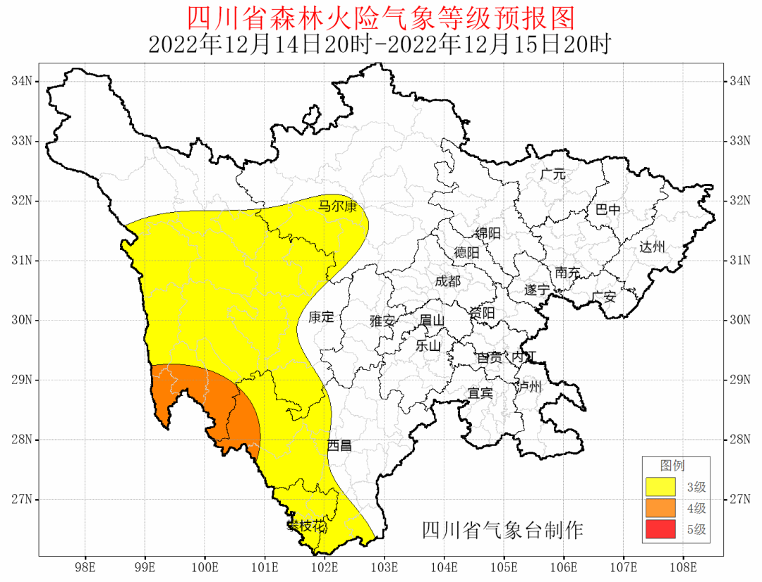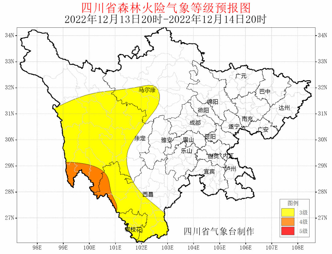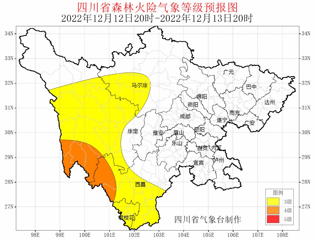 据最新气象资料分析:预计12月12日20时-15日20时,川西高原和攀西地区以多云到晴天气为主,空气干燥,森林火险气象等级为3级,局部4级。请相关州市加强火源管理,做好森林防火工作。