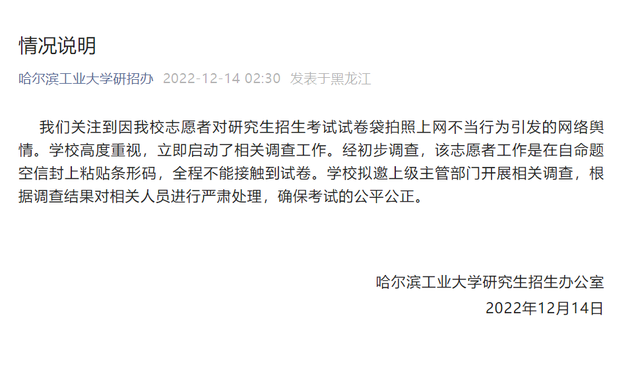 12月14日,哈尔滨工业大学研究生招生办公室通报:我们关注到因我校志愿者对研究生招生考试试卷袋拍照上网不当行为引发的网络舆情。学校高度重视,立即启动了相关调查工作。经初步调查,该志愿者工作是在自命题空信封上粘贴条形码,全程不能接触到试卷。学校拟邀上级主管部门开展相关调查,根据调查结果对相关人员进行严肃处理,确保考试的公平公正。