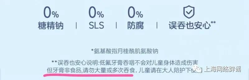 因此,有的品牌在产品首页宣称“可吞咽宝宝牙膏”的同时,还在详情页用小字标注“牙膏并非食品,请勿大量或多次吞食”。