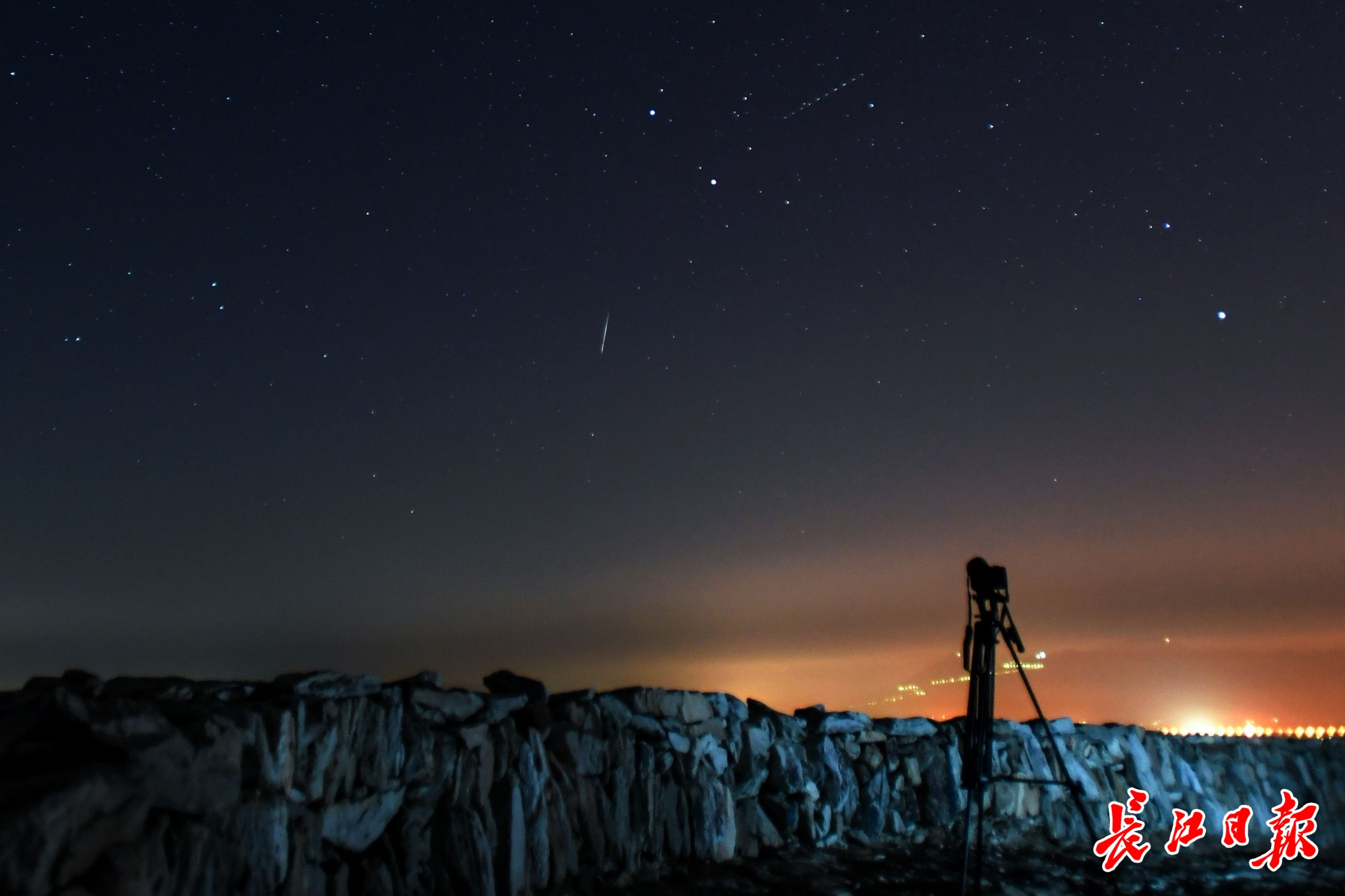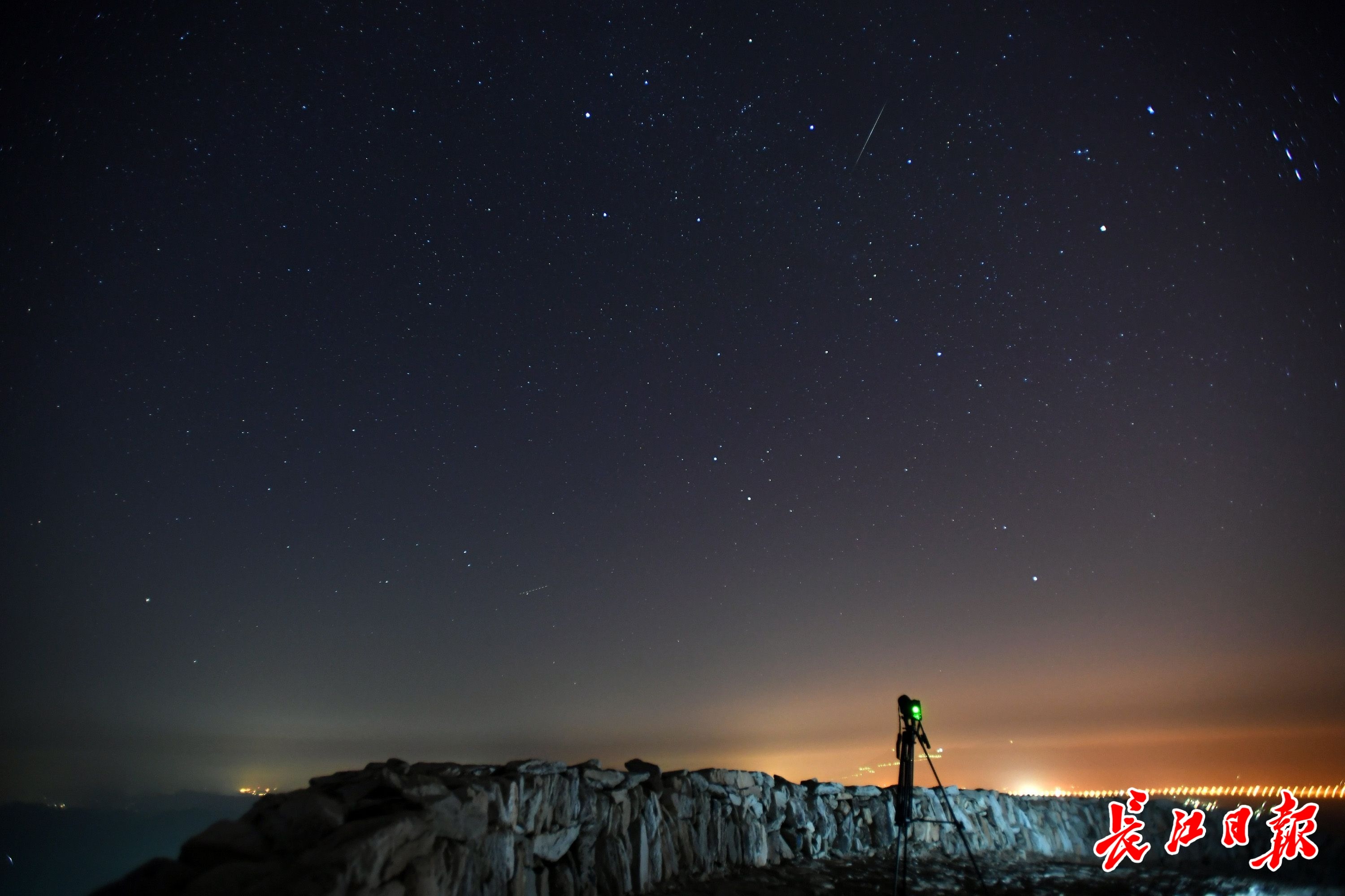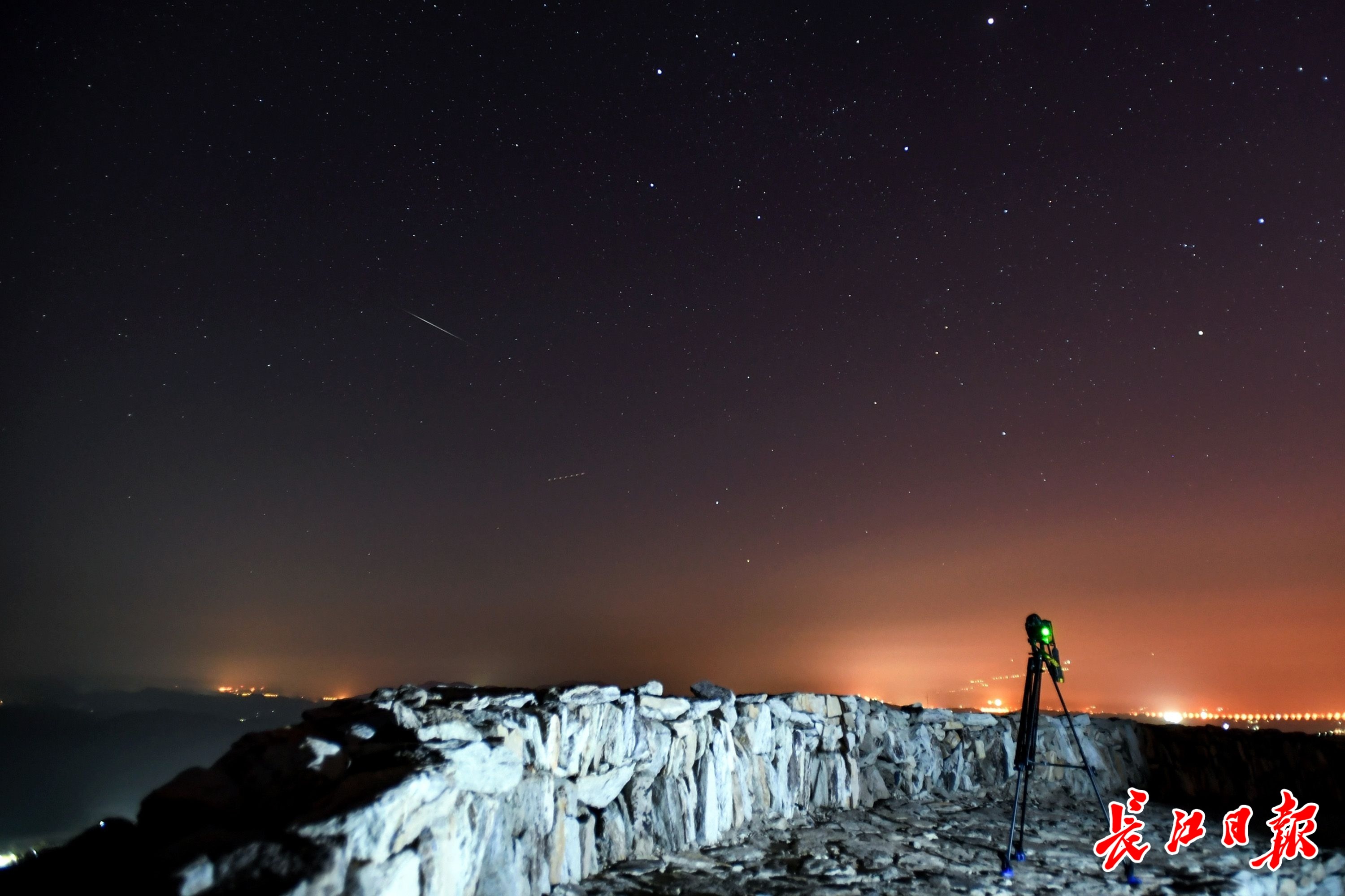 当日,几名星空爱好者从武汉市区出发,来到位于武汉市北郊的黄陂区龙王尖古寨遗址,欣赏流星雨带来的这场视觉盛宴。从20时开始,夜空中不时划过拖着或长、或短尾巴的流星,直至0时左右才明显减少,让爱好者们一饱眼福。