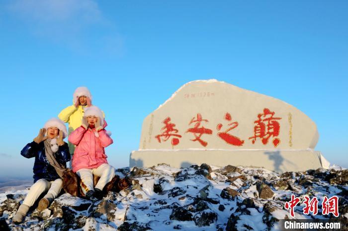 呼中区居民冒着严寒在“兴安之巅”石碑前合影。 冯宏伟 摄