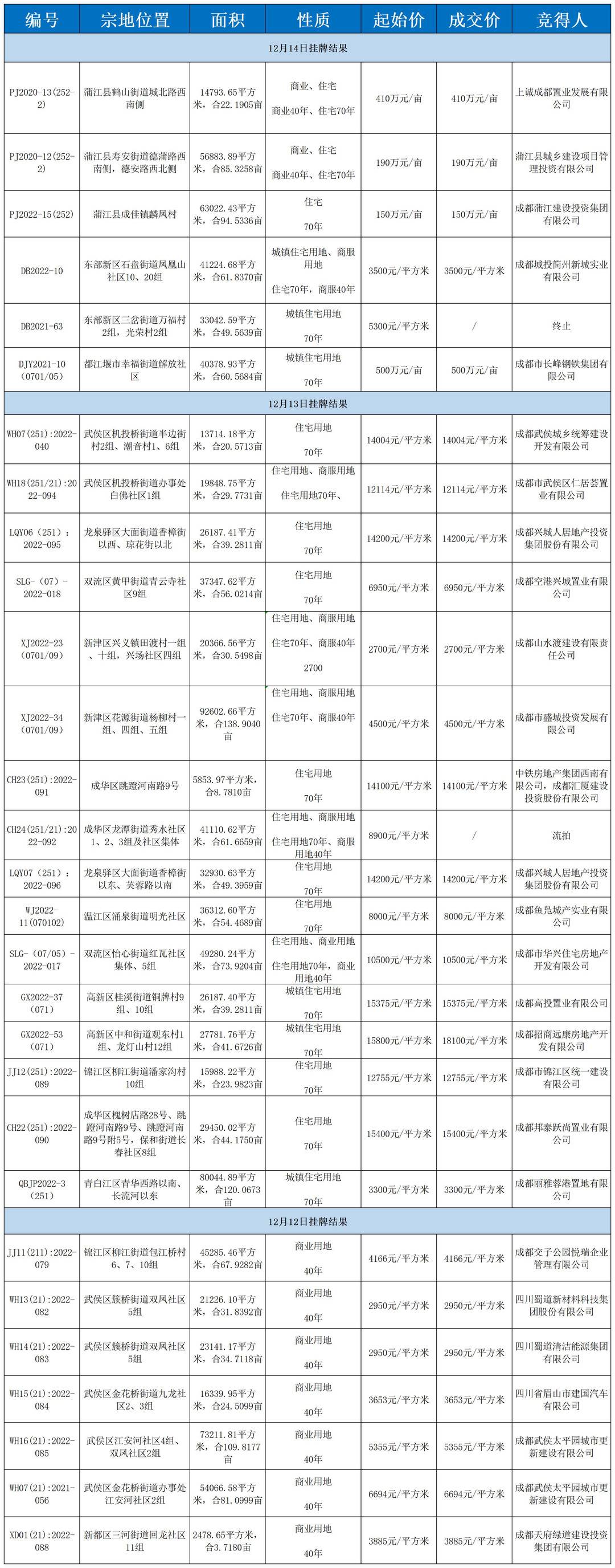 据成都公共资源交易中心网站,12月8日-12月14日,共有29宗非工业用地通过挂牌或拍卖形式交易,其中东部新区三岔街道万福村2组,光荣村2组地块因故终止,成华区龙潭街道秀水社区1、2、3组及社区集体地块流拍。