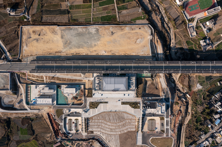 该车站轮廓结合当地巍峨的山谷进行造型,倾斜的屋檐凸显巍峨之势,候车厅铝条板弧形天花造型由抽象金口大峡谷蜿蜒崎岖山峰演化,候车厅出风口由金口大峡谷造型演变,建筑色彩从彝族当地传统服饰及河流主色调中提取,彰显了当地地域文化。