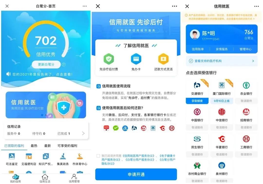 “先诊疗、后付费”信用就医简要来说,首先是市民自愿开通信用就医服务功能,自主选择未来帮助自己垫付就医款项的金融机构,并获得其授予的信用就医专属额度,额度范围在500-3000元,具体由市民的“个人信用白鹭分”分值确定。
