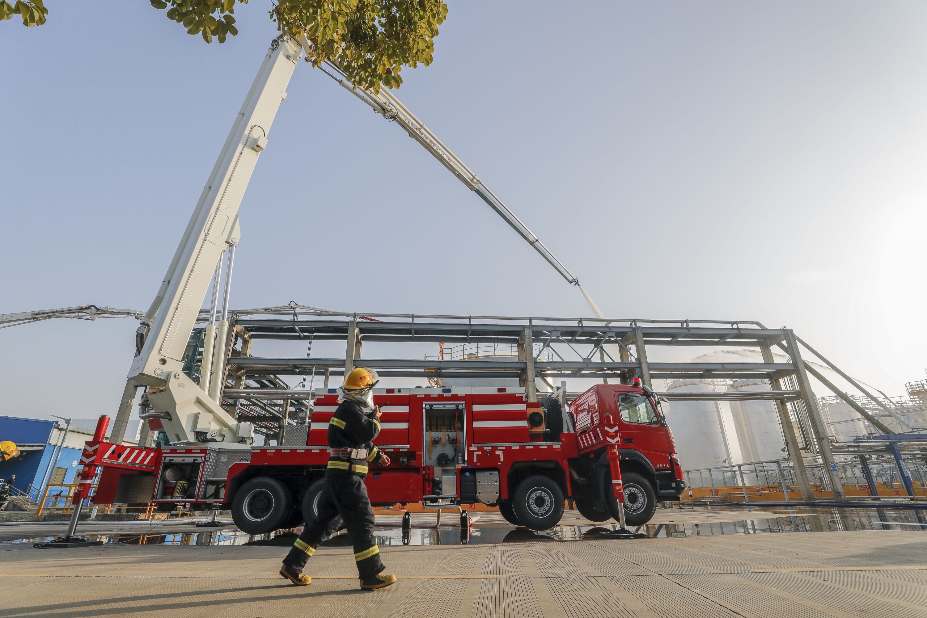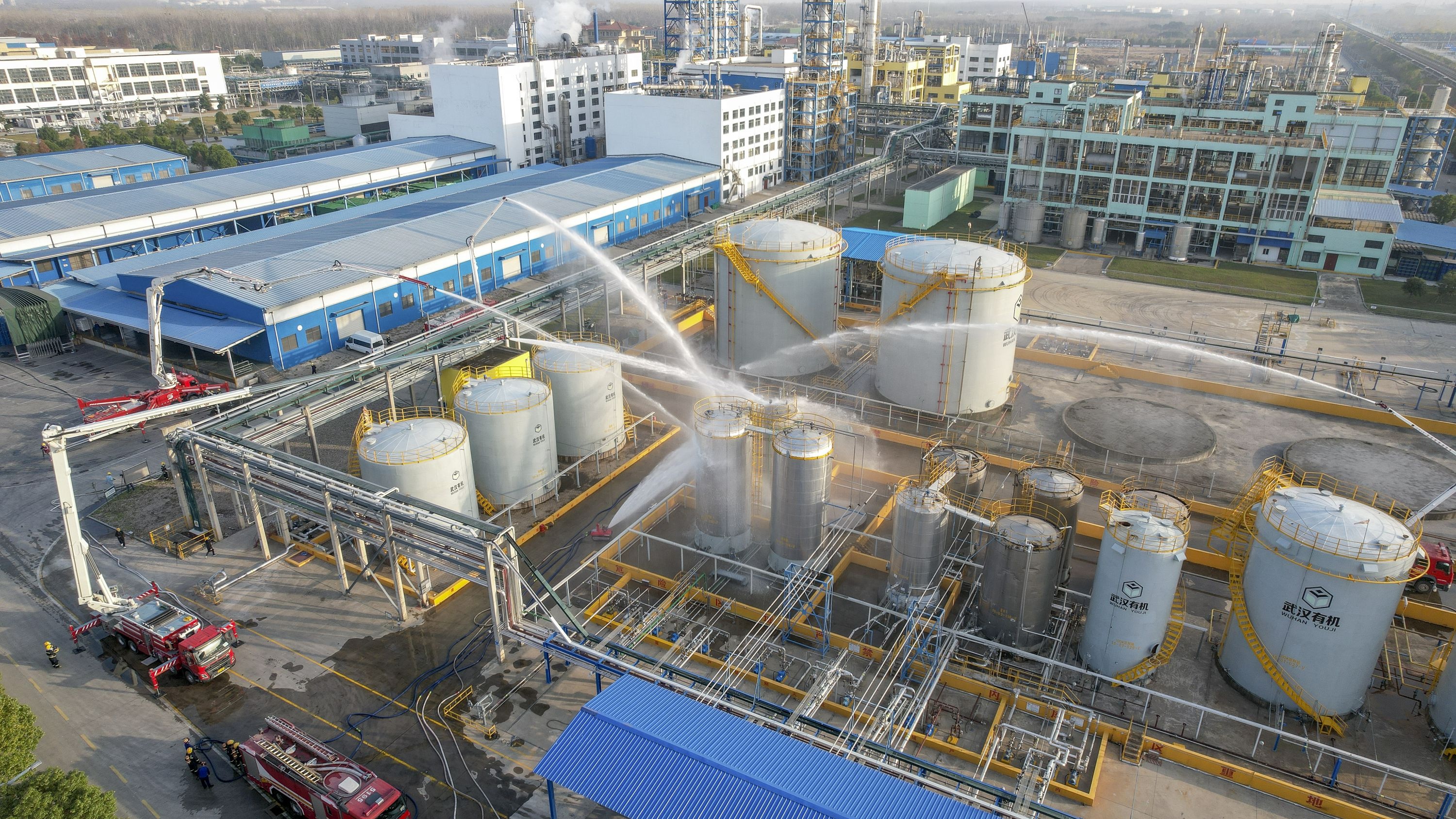 演练现场模拟武汉有机实业有限公司一辆满载环氧氯丙烷槽罐车在进行卸车作业时,环氧氯丙烷罐体法兰处发生泄漏,因卸车液体流速过快产生静电,罐体起火燃烧,火势扩大危及周边储罐安全。
