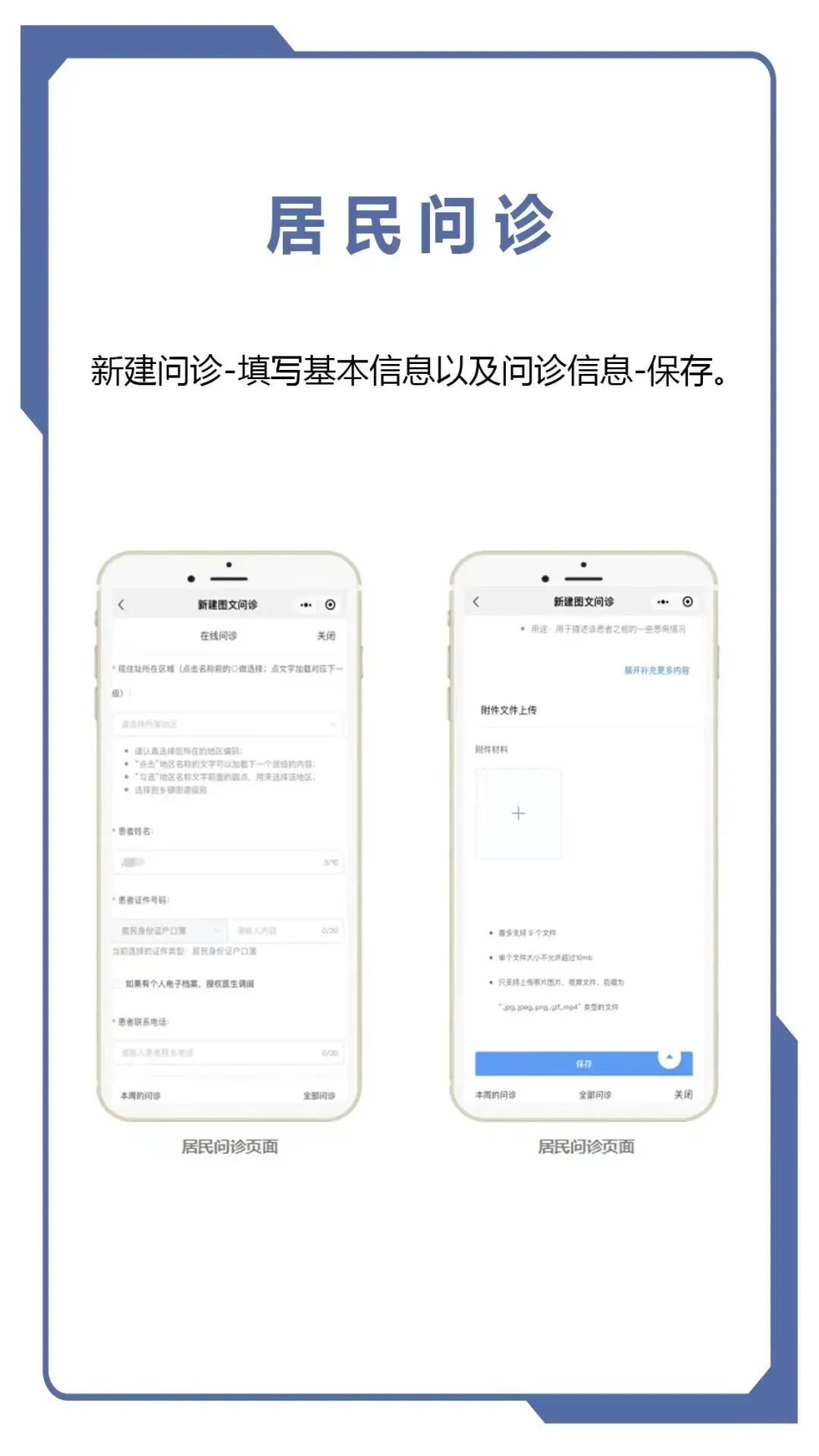 居民通过吉林家庭医生小程序首页“居民在线问诊”功能,进行线上问诊,以文字+图片形式描述问诊内容后保存,系统自动完成提交。