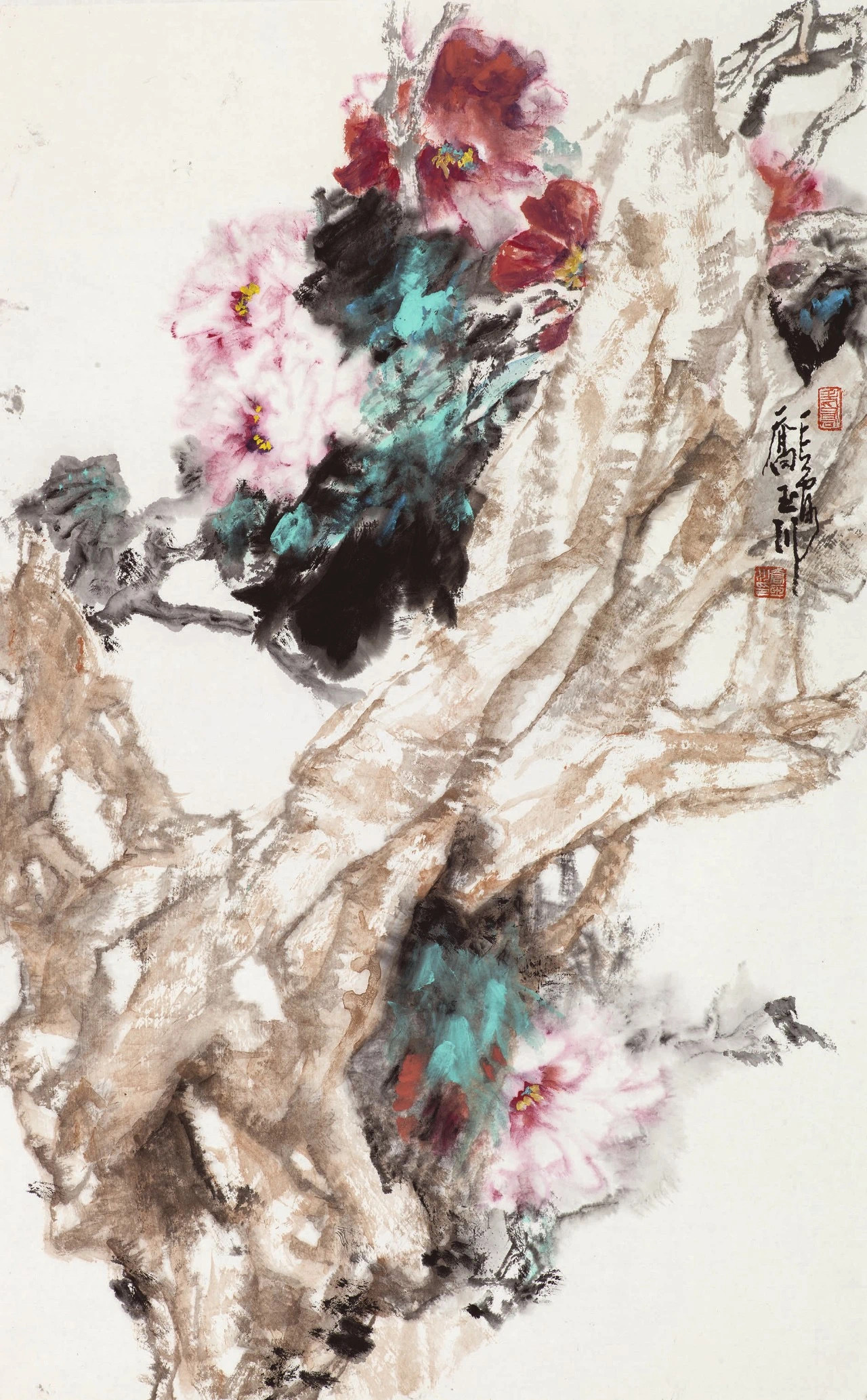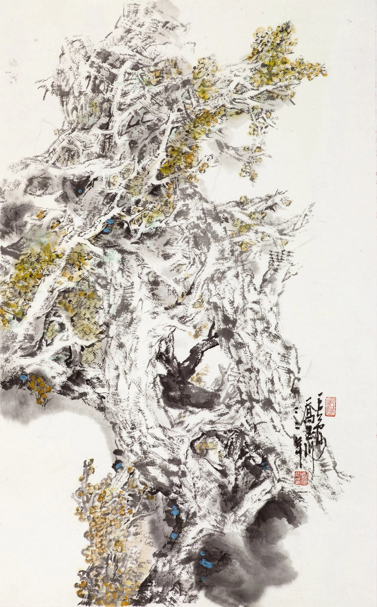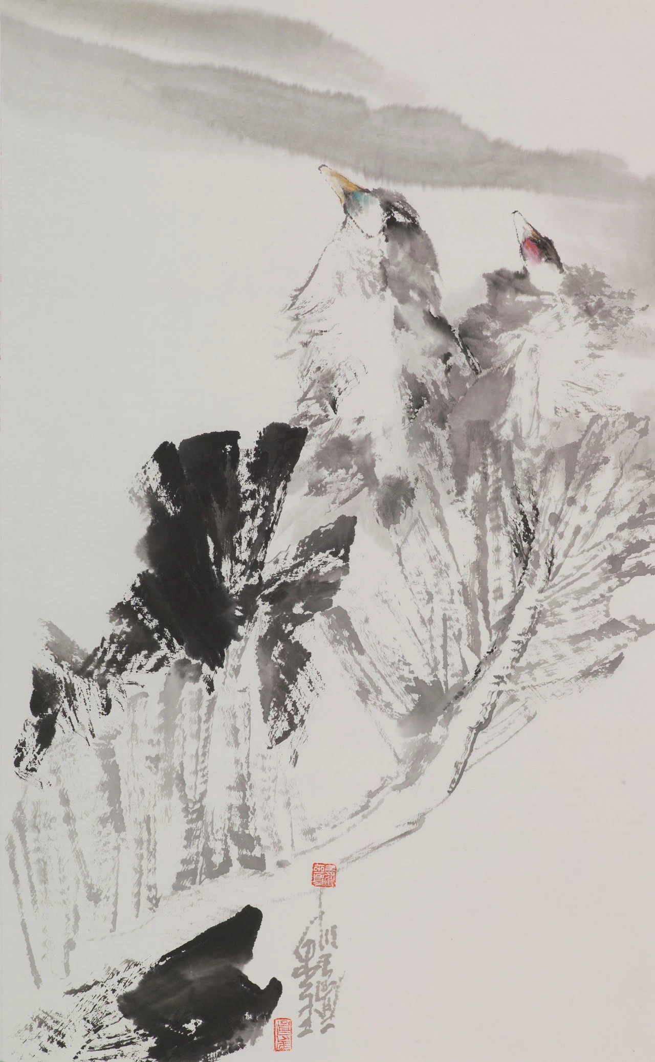 乔玉川是中国画全才、通才,不仅人物、山水、花鸟三科兼擅,而且三科融会贯通,无论人物、山水、花鸟表现的都是人的精神、自然的生命、画家的人格,这在当代中国画名家中也比较罕见。三科融会贯通的关键在于写意笔墨。他早年在西安美院中国画系学习,精通工笔,还学过油画,非常熟悉素描写实造型,经过几十年的修养和历练,他的写意笔墨日臻纯熟,表现力强,变化微妙,酣畅淋漓。他今年创作的古代和现代人物作品,已不是纯写实的造型,而是表现性的意象,几乎完全是以写意笔墨来塑造。他的人物形体吸收了山石的皴法,也采用了山石的结构,人物的面部或以线条勾勒,或以墨骨晕染。不仅如石刻玉雕,兼有山的阳刚气势和水的阴柔韵味。他的写意笔墨干湿浓淡的虚实处理也体现了阴柔相济、阴阳调和的道家美学。