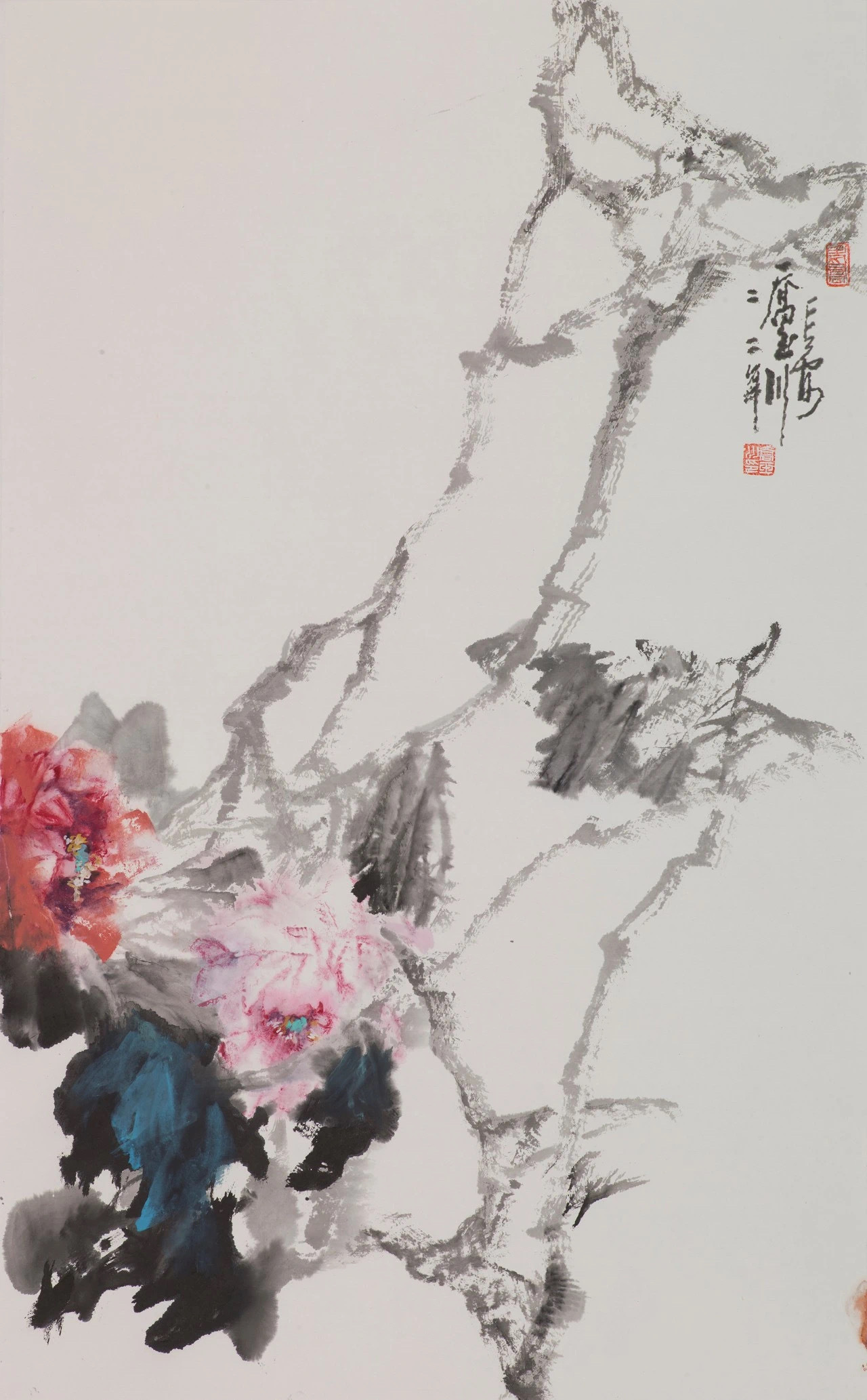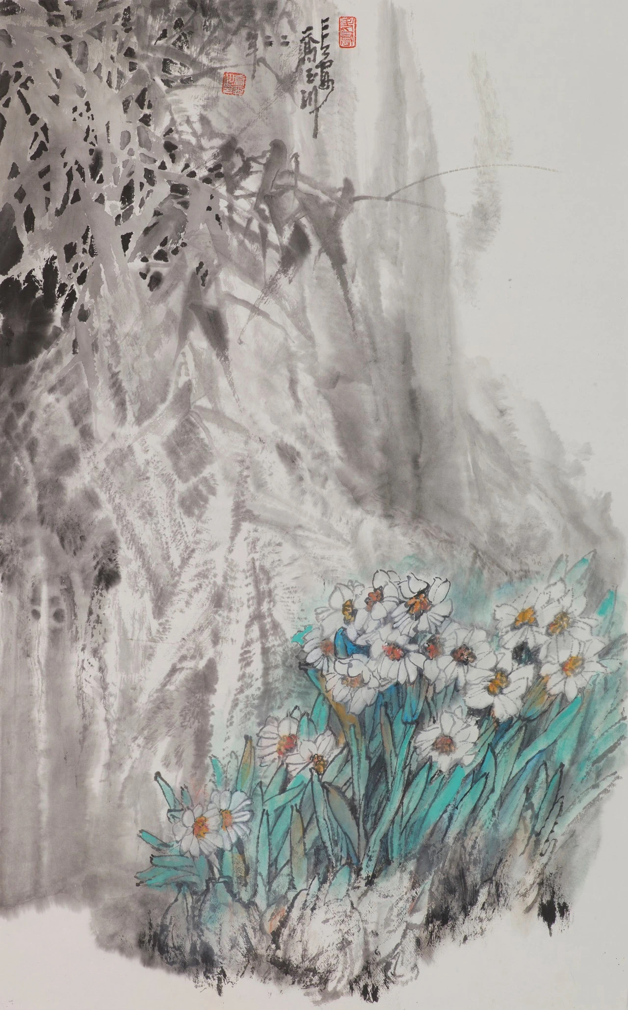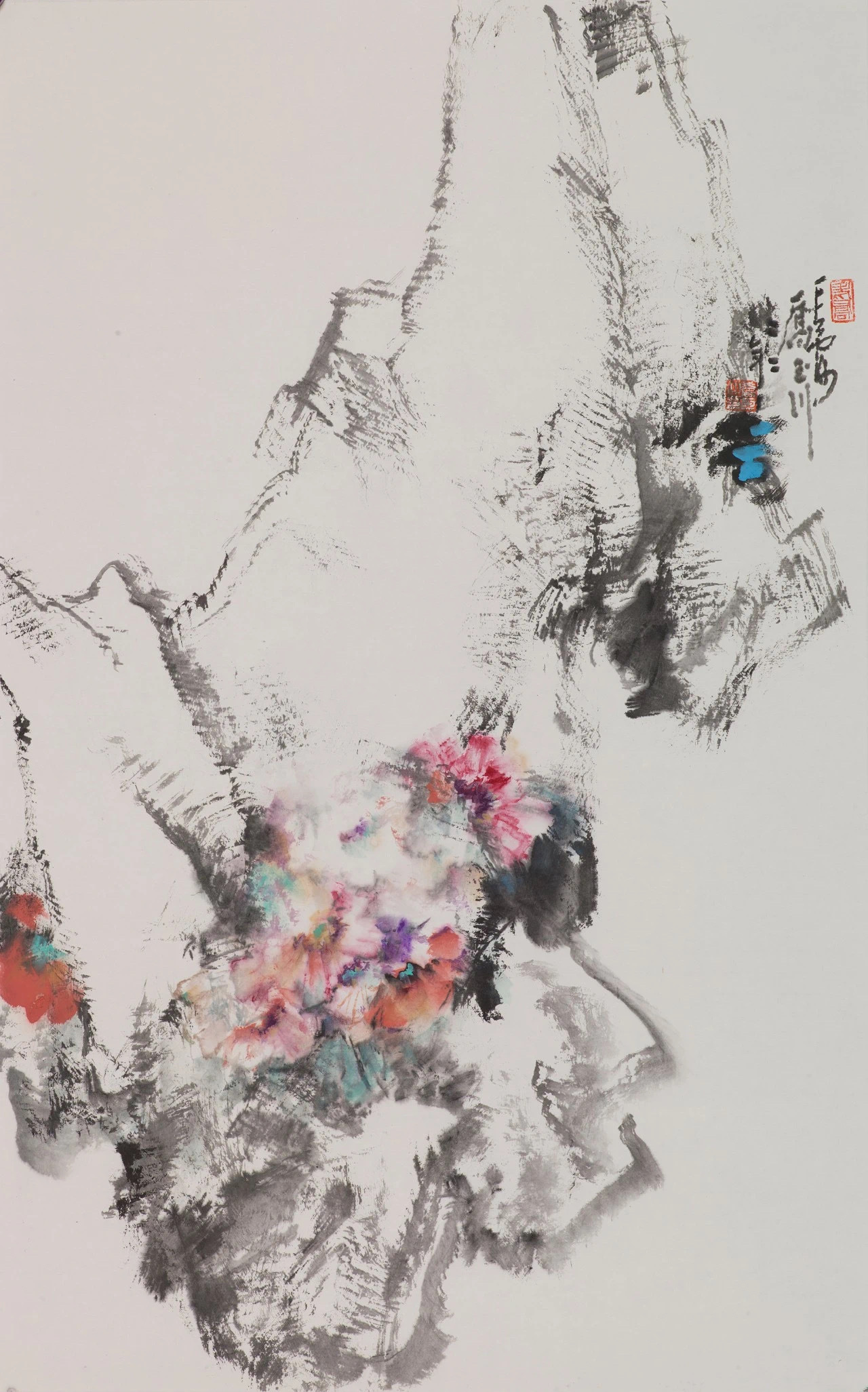 乔玉川是中国画全才、通才,不仅人物、山水、花鸟三科兼擅,而且三科融会贯通,无论人物、山水、花鸟表现的都是人的精神、自然的生命、画家的人格,这在当代中国画名家中也比较罕见。三科融会贯通的关键在于写意笔墨。他早年在西安美院中国画系学习,精通工笔,还学过油画,非常熟悉素描写实造型,经过几十年的修养和历练,他的写意笔墨日臻纯熟,表现力强,变化微妙,酣畅淋漓。他今年创作的古代和现代人物作品,已不是纯写实的造型,而是表现性的意象,几乎完全是以写意笔墨来塑造。他的人物形体吸收了山石的皴法,也采用了山石的结构,人物的面部或以线条勾勒,或以墨骨晕染。不仅如石刻玉雕,兼有山的阳刚气势和水的阴柔韵味。他的写意笔墨干湿浓淡的虚实处理也体现了阴柔相济、阴阳调和的道家美学。