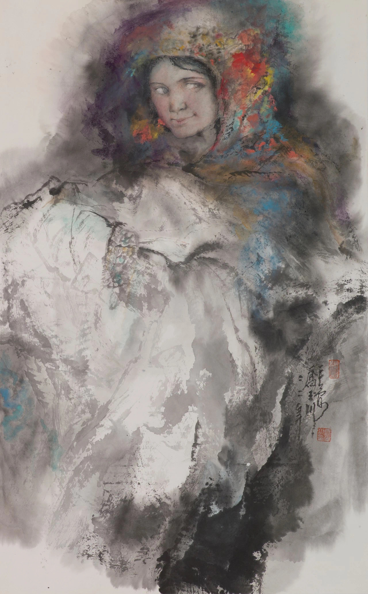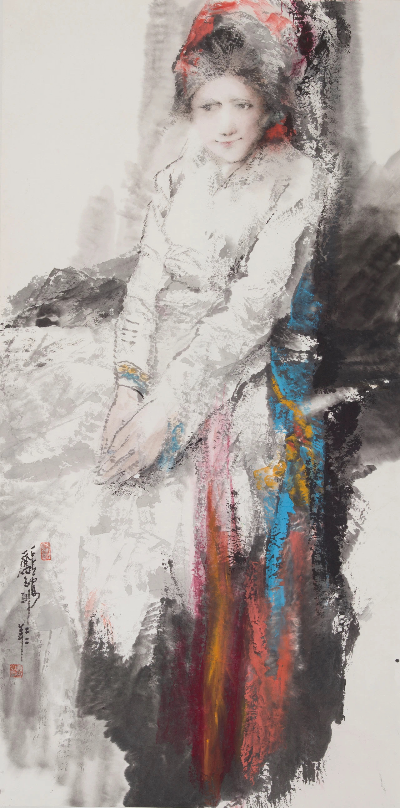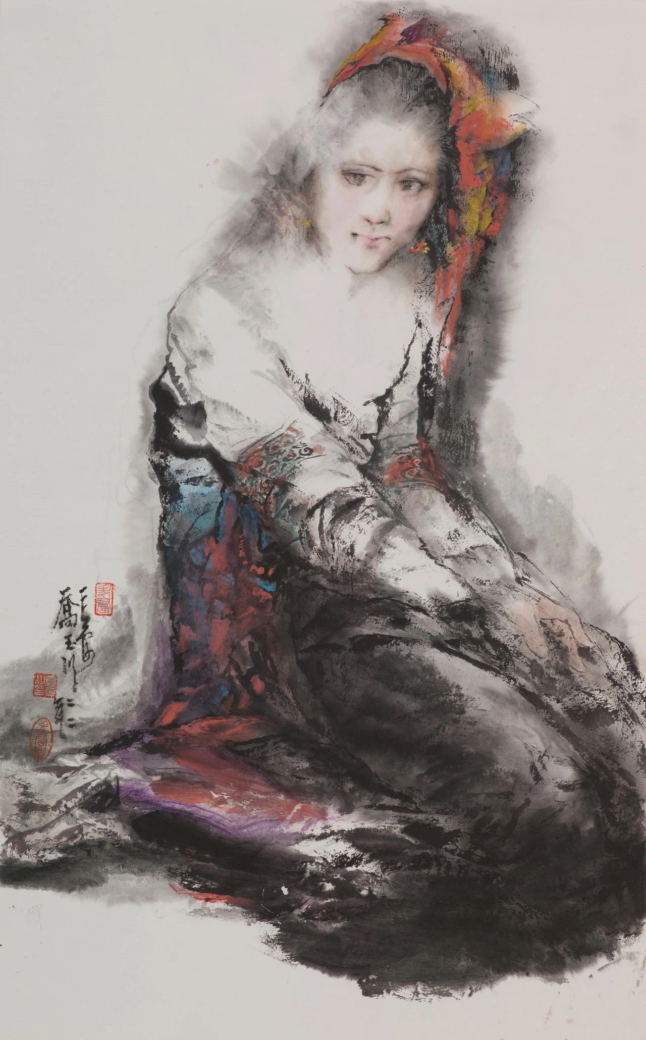 看乔玉川先生的作品,他最着力画的人物是美女和老者。他追求理想中最美的女性,像是现代罗敷;他画古代的智者,极具历史感。他对这两个形象不厌其烦地琢磨完善,并且自创了这两个理想的人物程式,他用写生的图式创作了属于乔氏的人物图式。一个艺术家为什么用这么大的精力来塑造非古典、西方、罗马的程式?我想,这肯定蕴含了他自己与众不同的艺术理想在里面,他给我们提供了一个值得研究的个案。他的笔墨是点式,他将油画的用笔形式借用到水墨上来,形成了其绘画的基本特点。他善于用虚,虚的笔触、墨色,但整个画面氛围却是实的,这是他长期以来摸索出来的绘画形式。